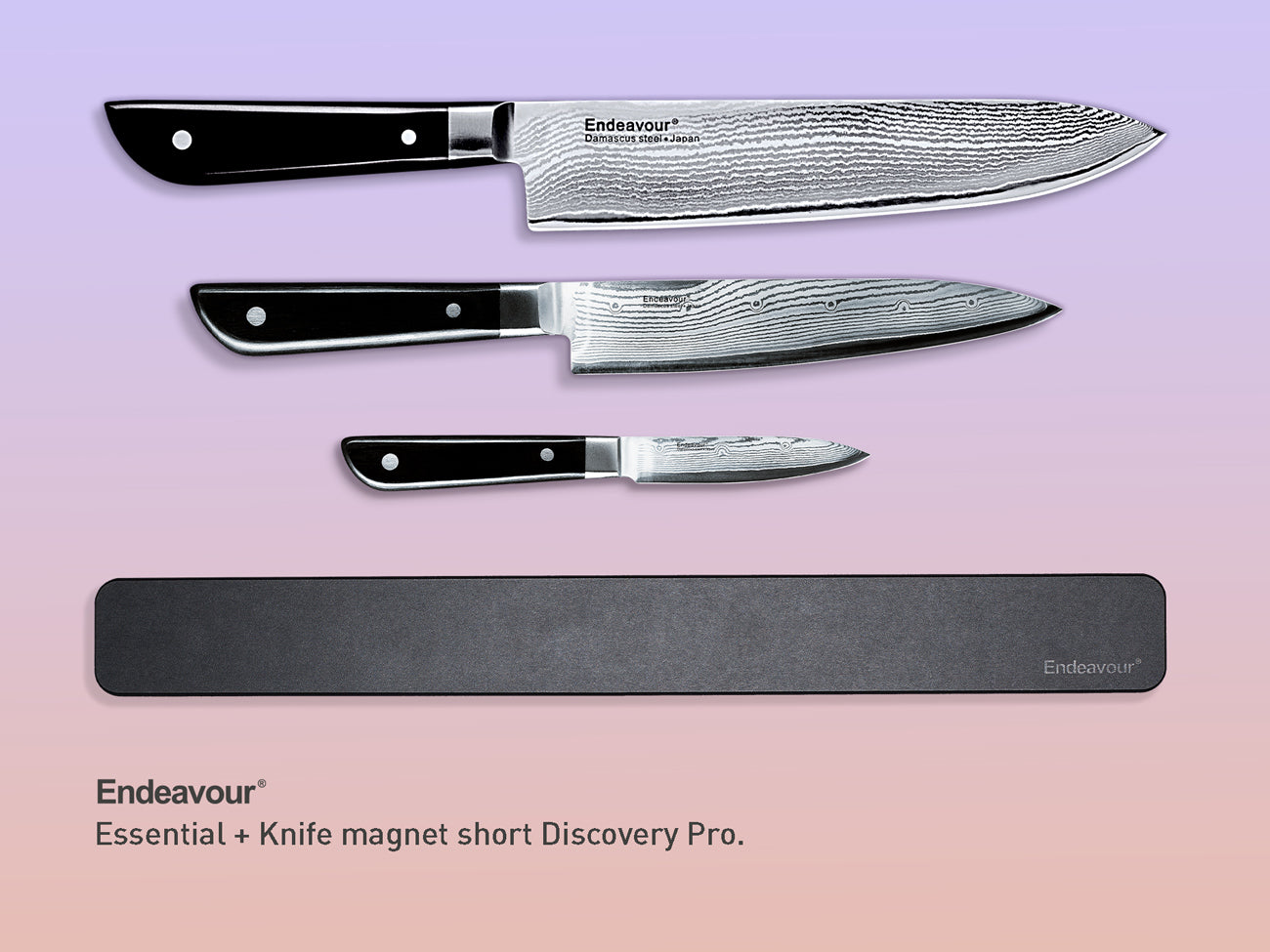 Discovery Pro Essential + Knife Magnet Short. Dette sæt indeholder tre alsidige knive og en stilren knivmagnet, der passer perfekt til ethvert køkken. Knivene - den kompakte Herb, den praktiske Fruit og den kraftfulde Green Chopper, klarer alle opgaver med præcision.