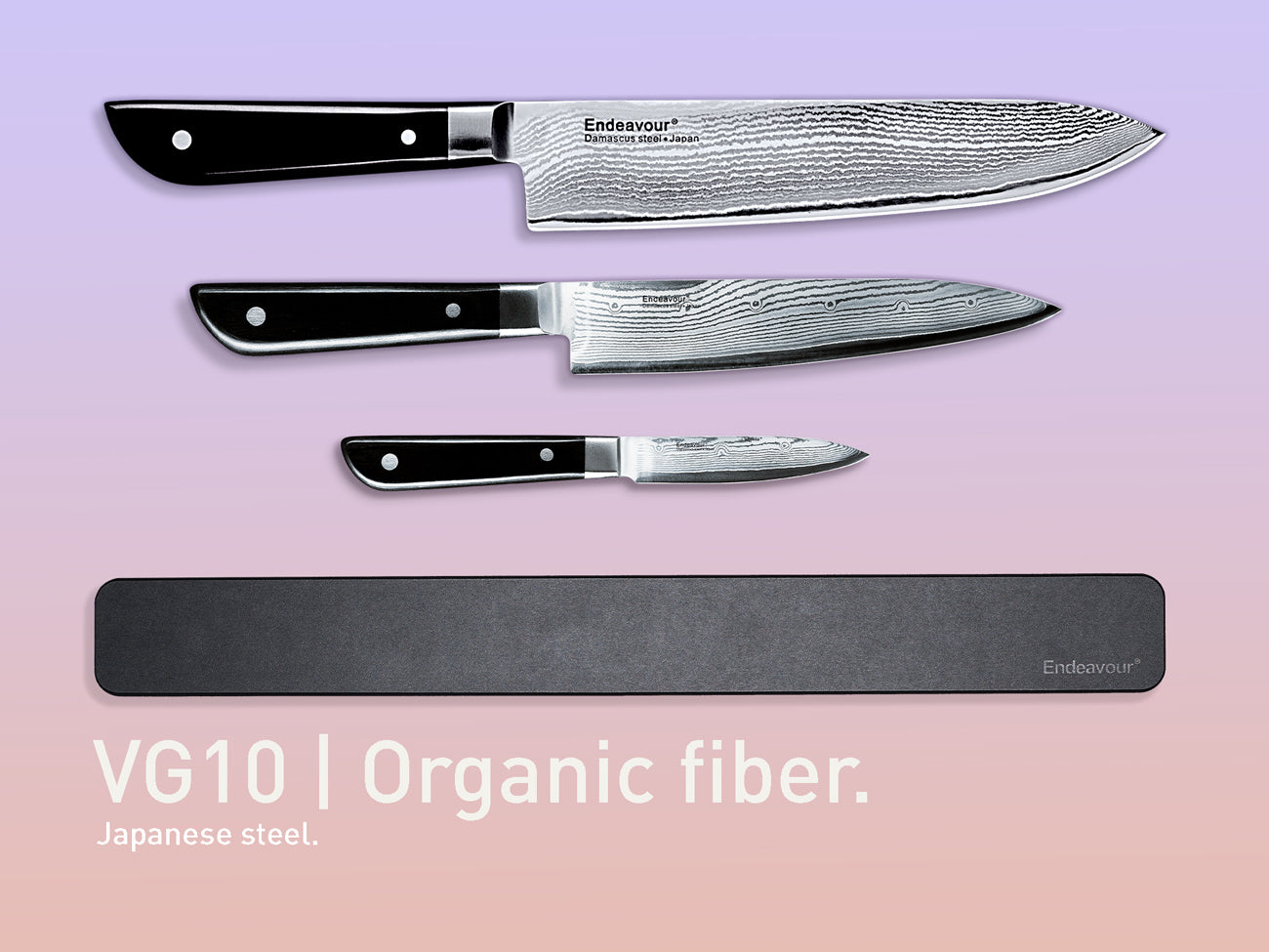 Knivene er smedet med VG10-stål fra Takefu Special Steel Co. i Echizen, Japan.