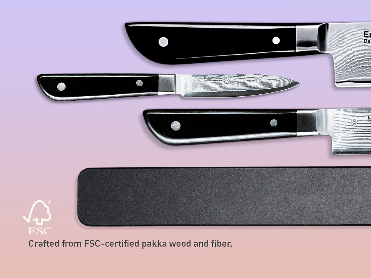 Håndtag: Det FSC®-certificerede pakka wood gør en enorm forskel, da det er modstandsdygtigt over for varme og fordrejning. Pakka-træet er vandafvisende og sikrer stabil kontrol over knivene. Det består af sammenpressede træfibre behandlet med harpiks. Håndtaget er udformet ergonomisk og grebet er derfor behageligt at holde på.