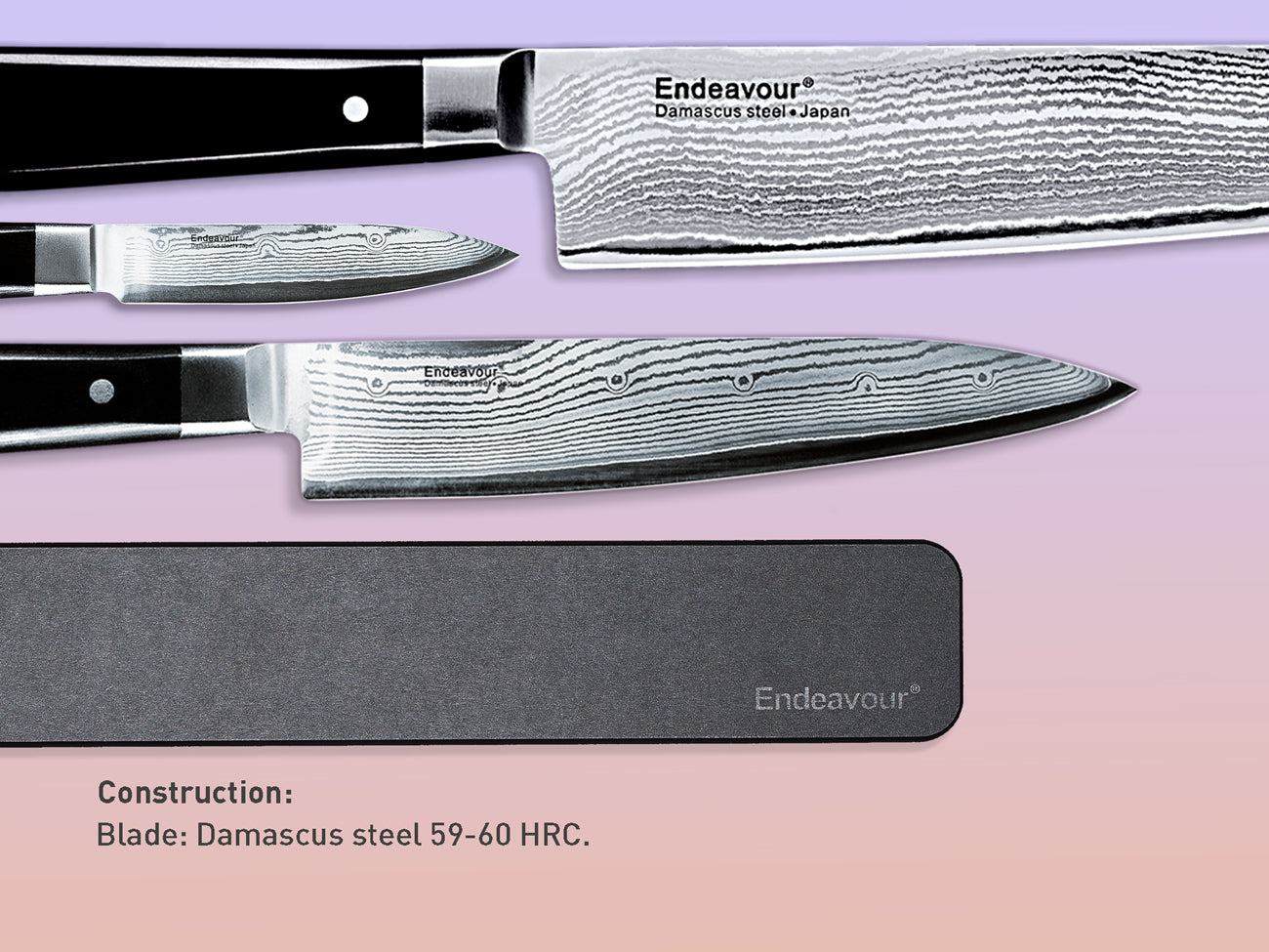 Stål: Discovery Pro-knivene er fremstillet af førsteklasses japansk VG10-stål fra Takefu Special Steel Co. i Echizen, Japan. Dette højtydende stål sikrer enestående styrke, holdbarhed og skarphed. Klingerne er håndslebet, poleret og består af 67 lag damasceret stål. De er hærdet ved over 1000 °C og afkølet til under -180 °C, hvilket giver en hårdhed på 60-61 HRC – knivskarpe, lette og kraftfulde værktøjer.