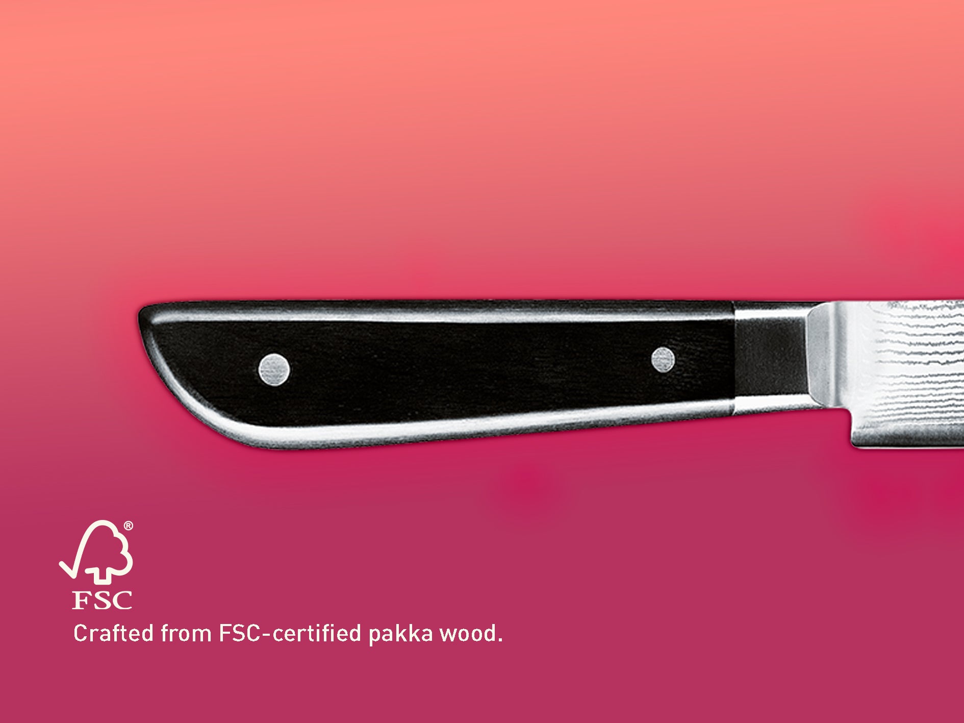 Håndtag: Det FSC®-certificerede pakka wood gør en enorm forskel, da det er modstandsdygtigt over for varme og fordrejning. Pakka-træet er vandafvisende og sikrer stabil kontrol over kniven. Det består af sammenpressede træfibre behandlet med harpiks. Håndtaget er udformet ergonomisk og grebet er derfor behageligt at holde på.
