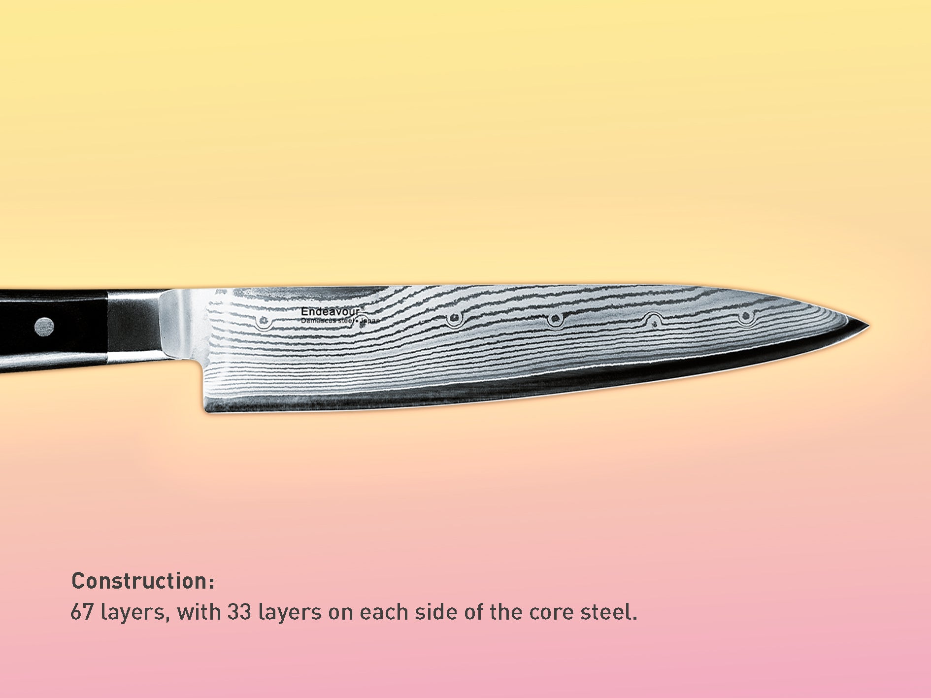 Kniven er smedet i 67 lag, med 33 lag på hver side af kernestålet.