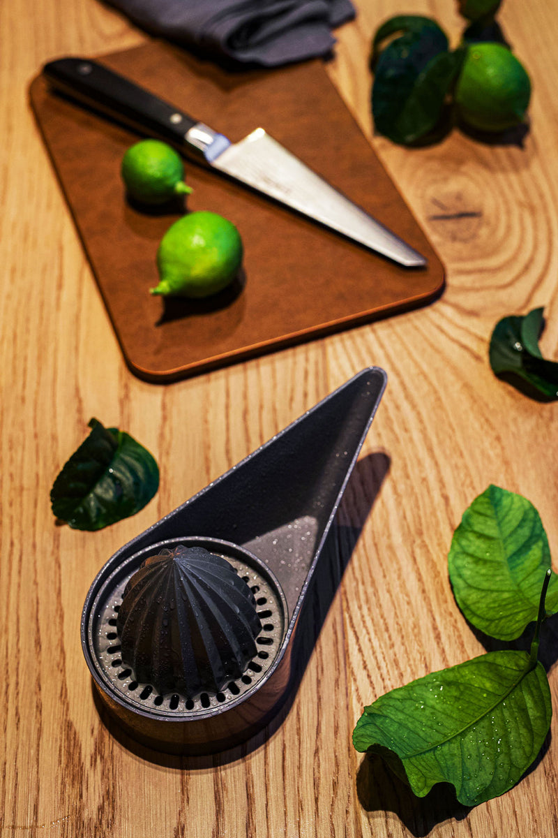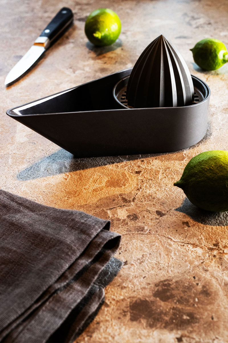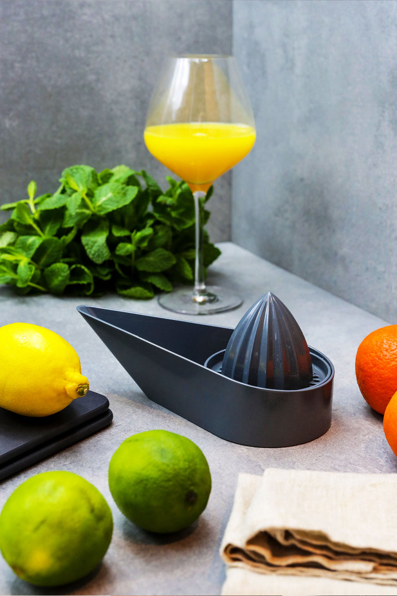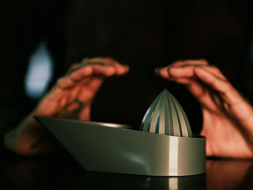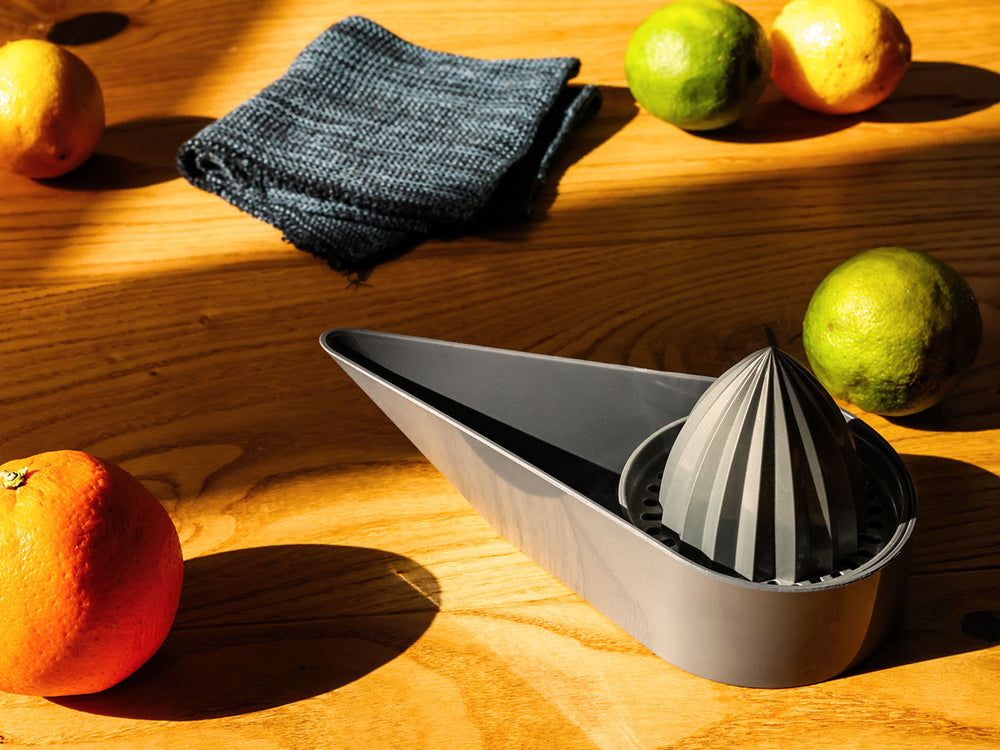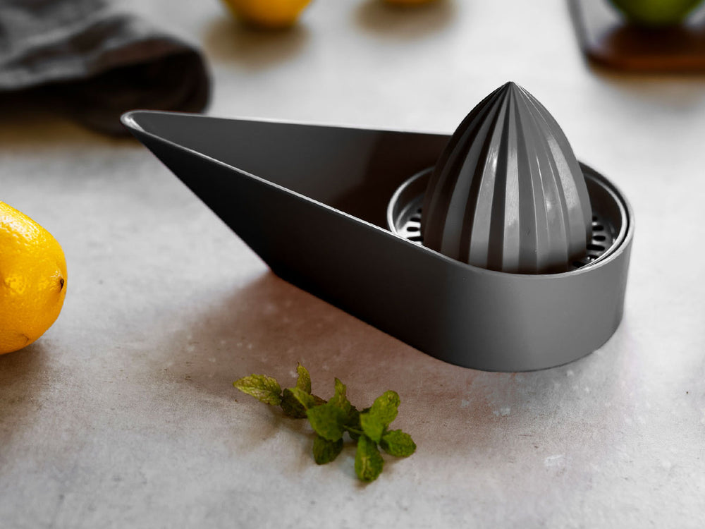 The citrus press is made of PLA (PolyLacticAcid), a 100% biodegradable plastic derived from plants and resin, possessing the same properties as conventional plastic. The design is intended to allow juice to flow easily while sorting out the seeds at the top.