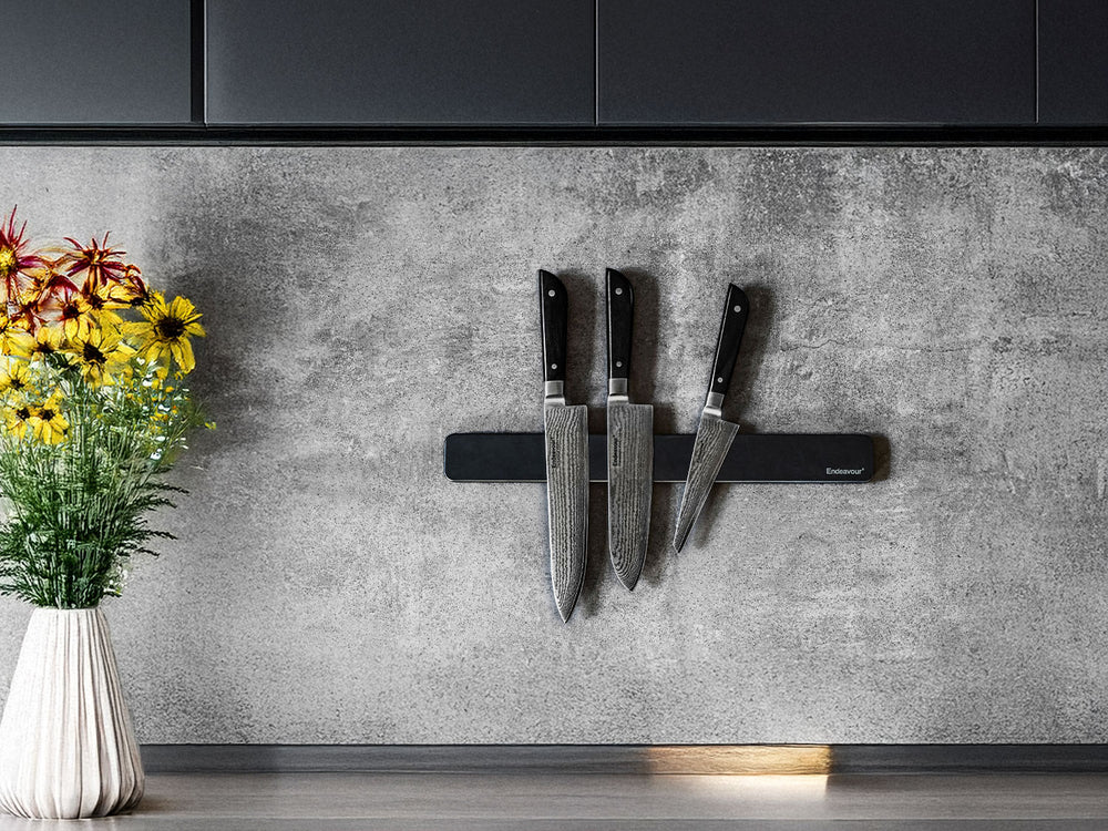 The knife magnet helps declutter your kitchen by utilizing wall space and keeping your knives easily accessible without taking up valuable countertop or drawer space.