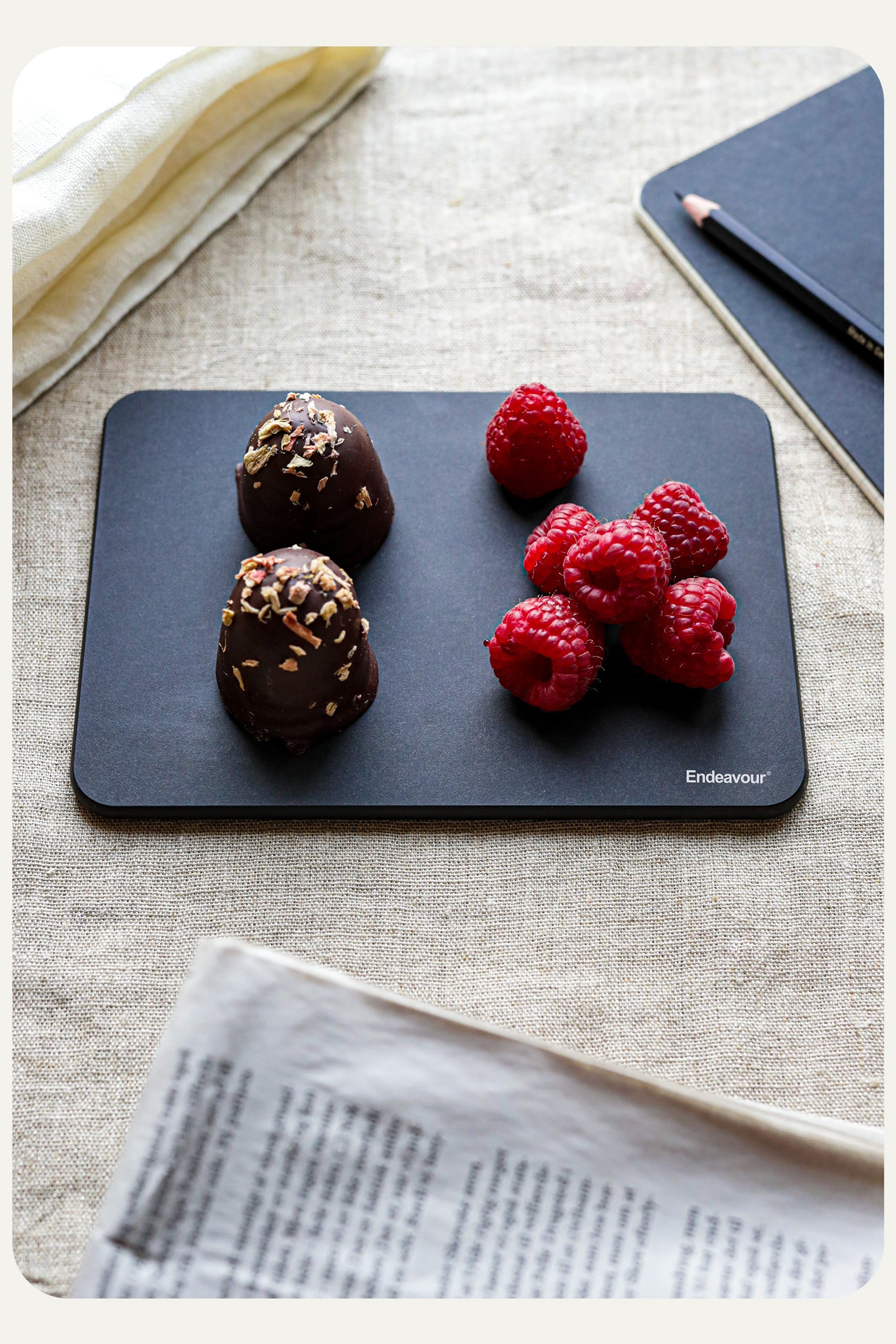 The cutting board is made from FSC®-certified organic fibers sourced from sustainable forestry. A durable and heat-resistant material that protects the knife edge and withstands temperatures up to 170°C, making it ideal as a base for hot pots. It is through-colored in Night Black. Organic fiber also resists discoloration from food – offering both hygienic and aesthetic benefits.