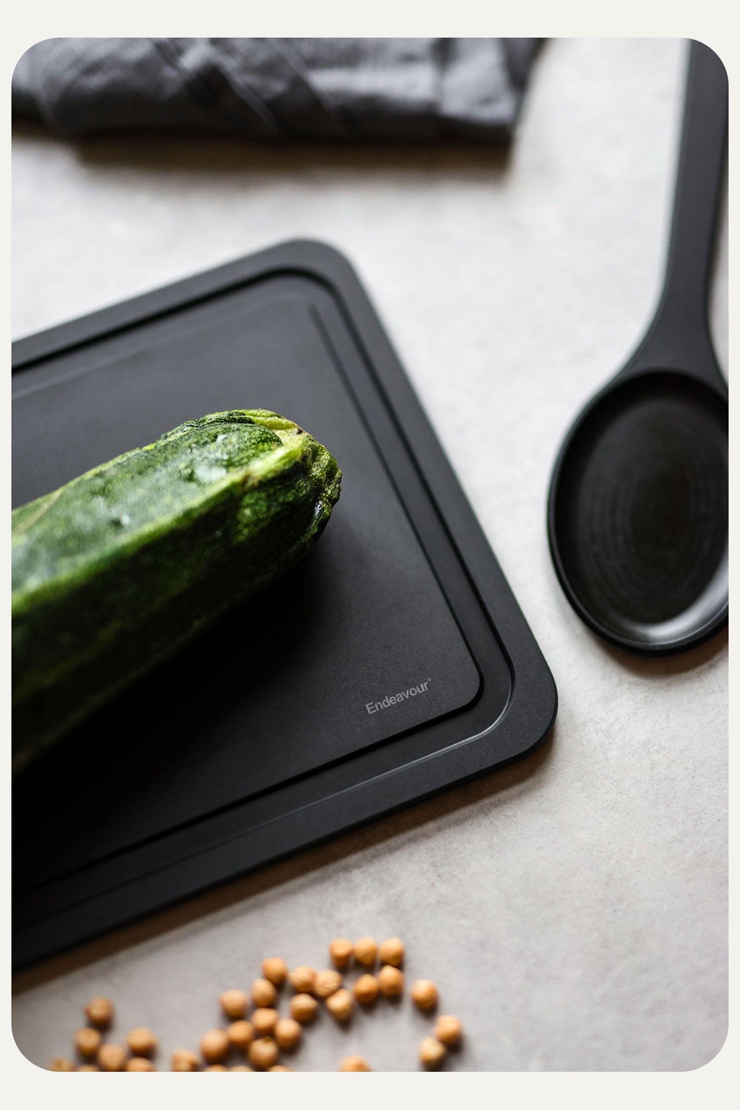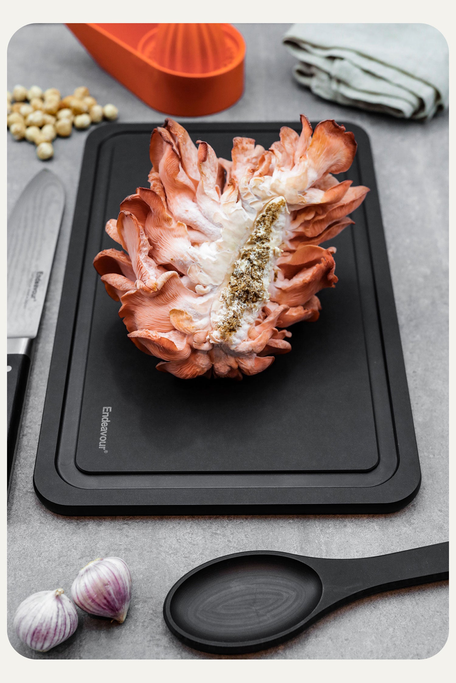 The cutting board is made from FSC®-certified organic fibers sourced from sustainable forestry. A durable and heat-resistant material that protects the knife edge and withstands temperatures up to 170°C, making it ideal as a base for hot pots. It is through-colored in Night Black. Organic fiber also resists discoloration from food – offering both hygienic and aesthetic benefits.