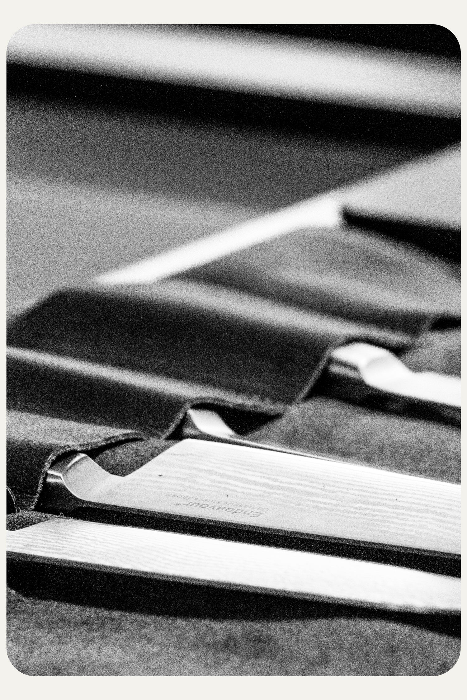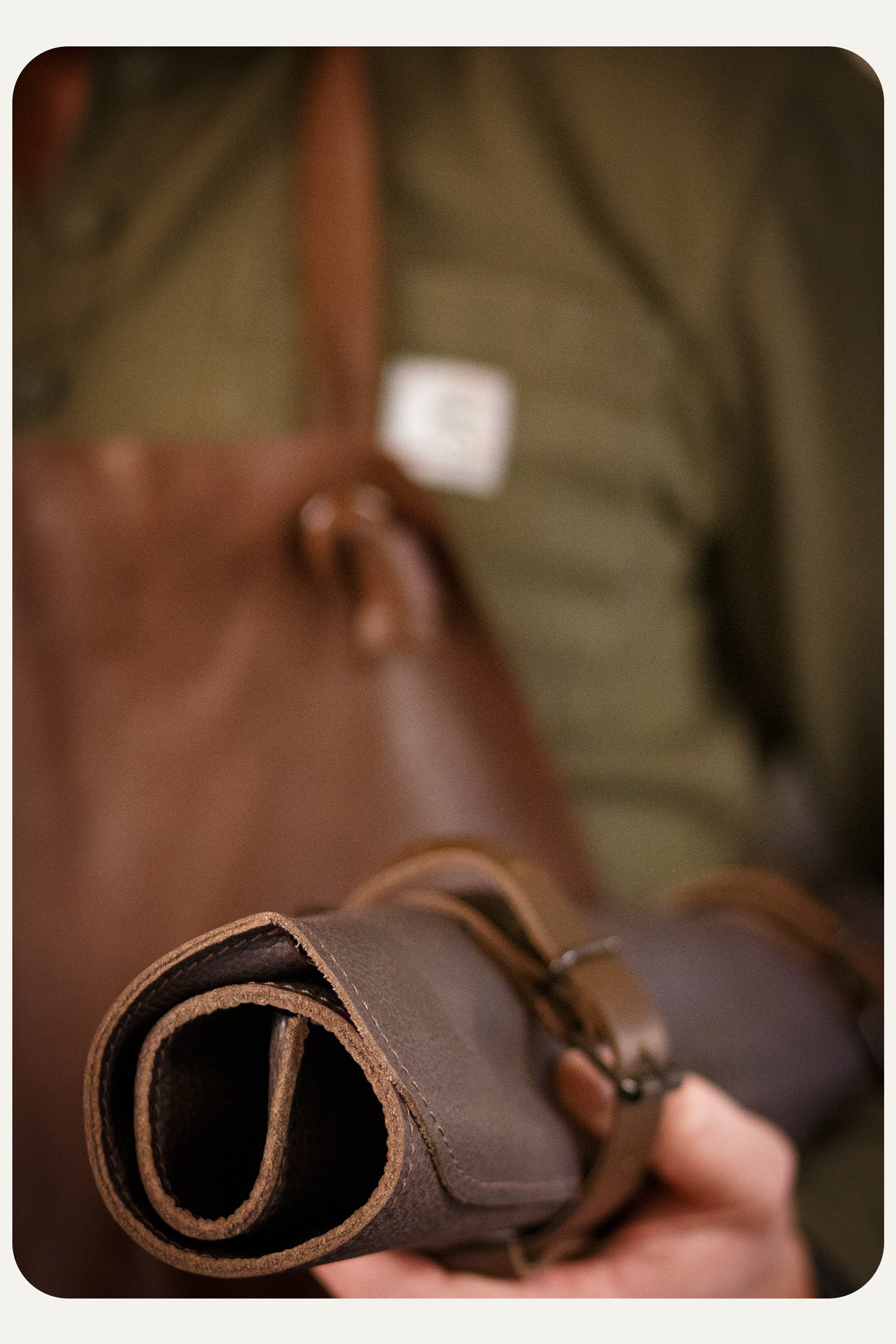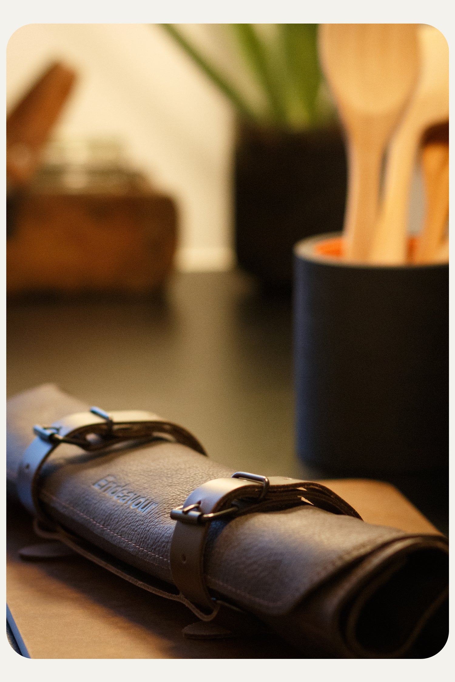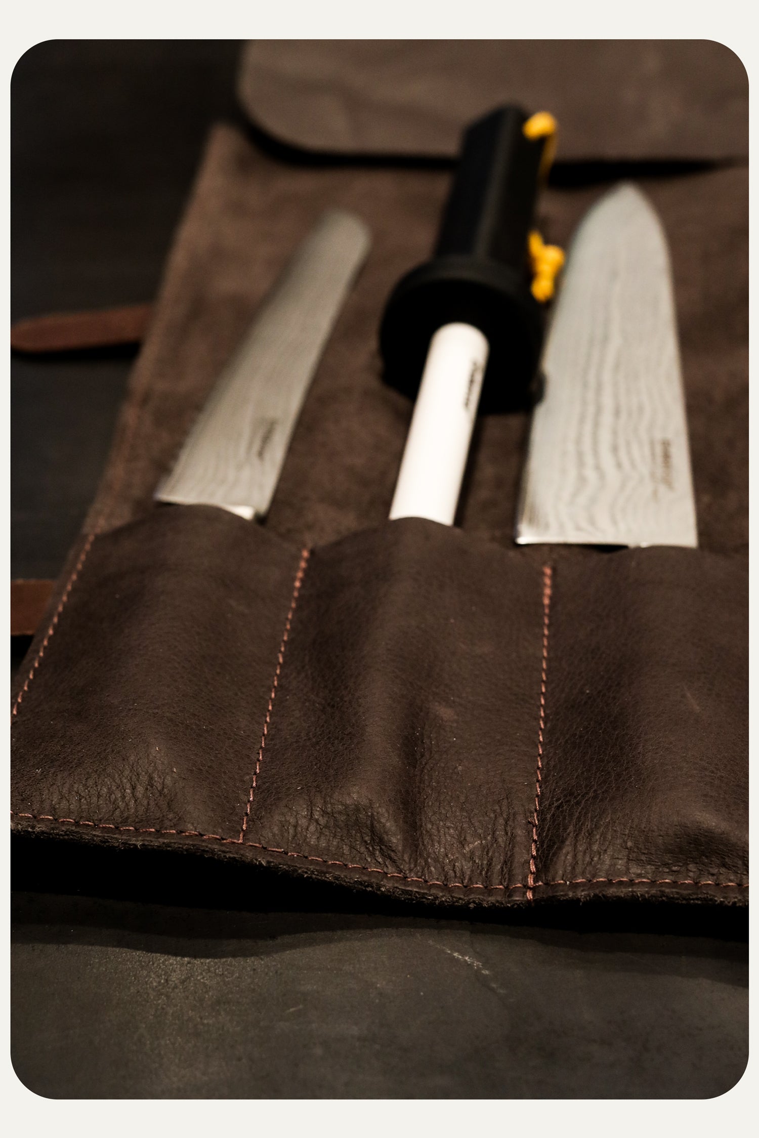 The knife bag is handcrafted in Holland and made from the finest European buffalo leather. The full-grain leather is carefully treated with only color and oil – nothing else. The result is the softest and most durable leather achievable. A knife bag ensures that knives are not damaged during transport. Professional chefs prefer knife bags to transport their knives. This one can contain 5 chef knives.