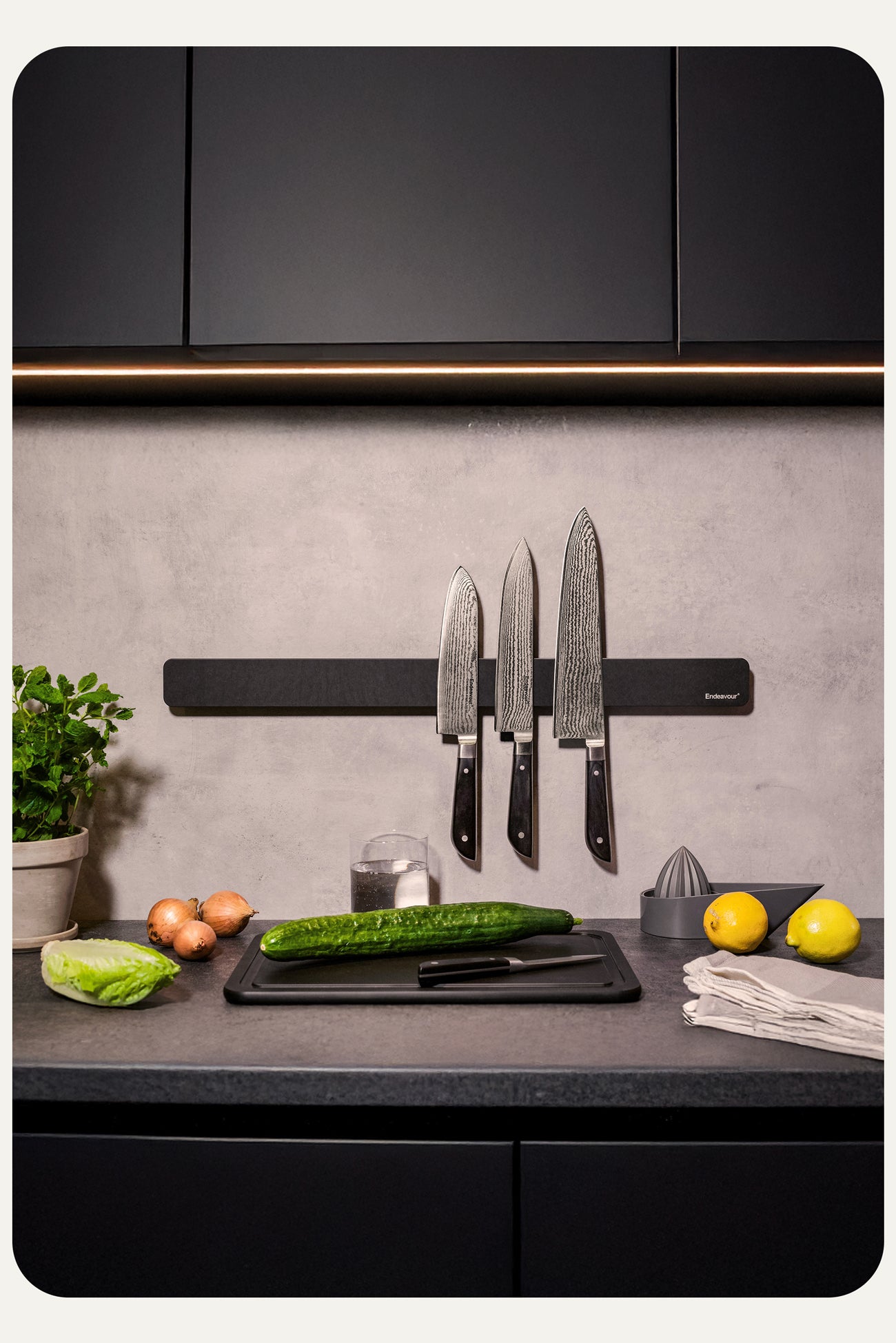 The knife magnet helps declutter your kitchen by utilizing wall space and keeping your knives easily accessible without taking up valuable countertop or drawer space.