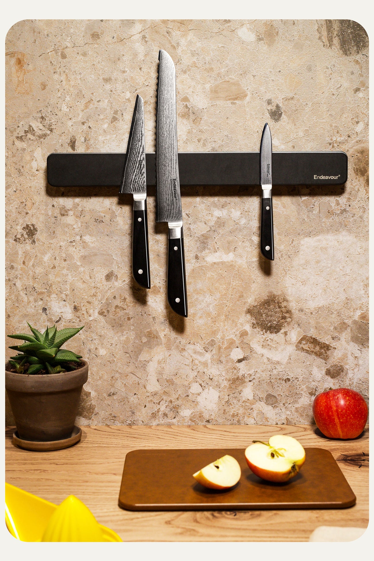The knife magnet is made of FSC®-certified organic fiber - sustainable compressed fibers. With hidden powerful magnets that ensure a strong hold for your knives. Stylish design with a functional shape.