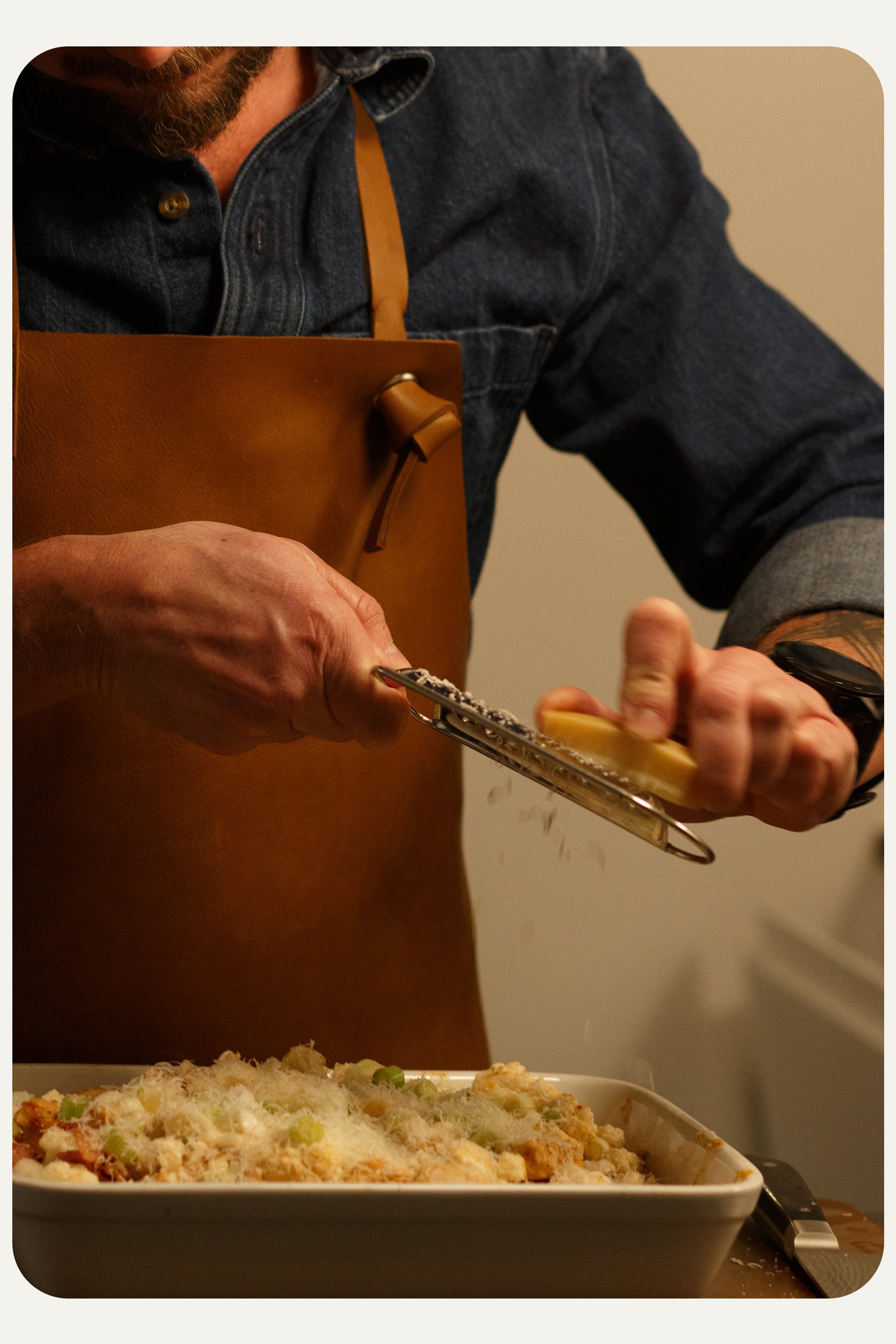 The apron is handmade and crafted in Denmark using premium Scandinavian aniline leather. With over 90 years of experience in leatherwork, our workshop ensures every detail is elegantly executed, guaranteeing high quality. Traditional tools and modern machinery have been employed to cut and produce precise details in our durable and beautiful leather.