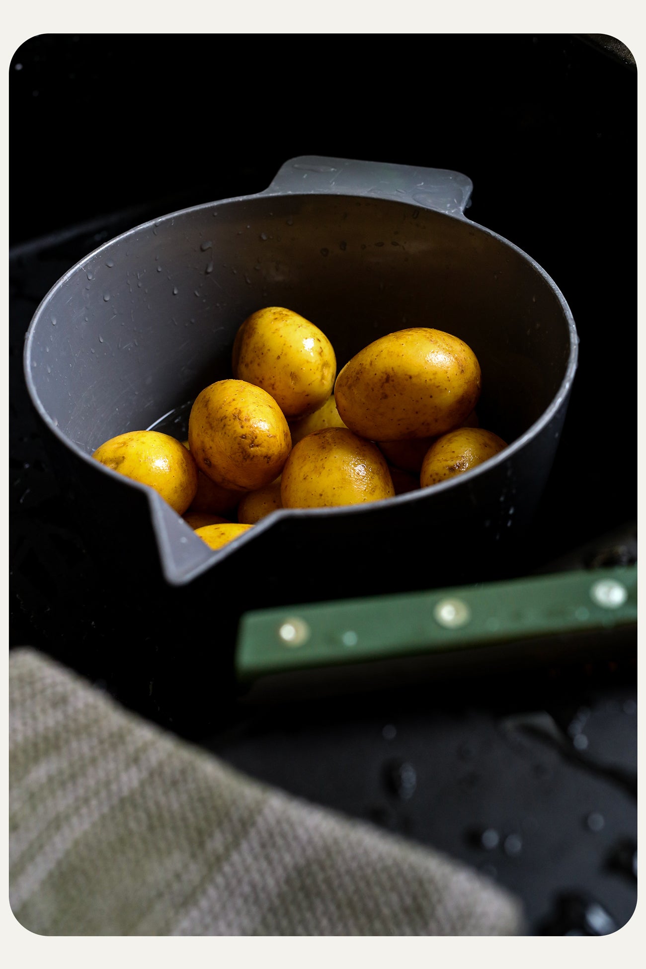 The mixing bowls come in a set of two. The gray one holds 3 liters, and the sunny yellow one holds 2.5 liters. Both bowls are equipped with a silicone ring at the bottom, ensuring stability on the kitchen counter.