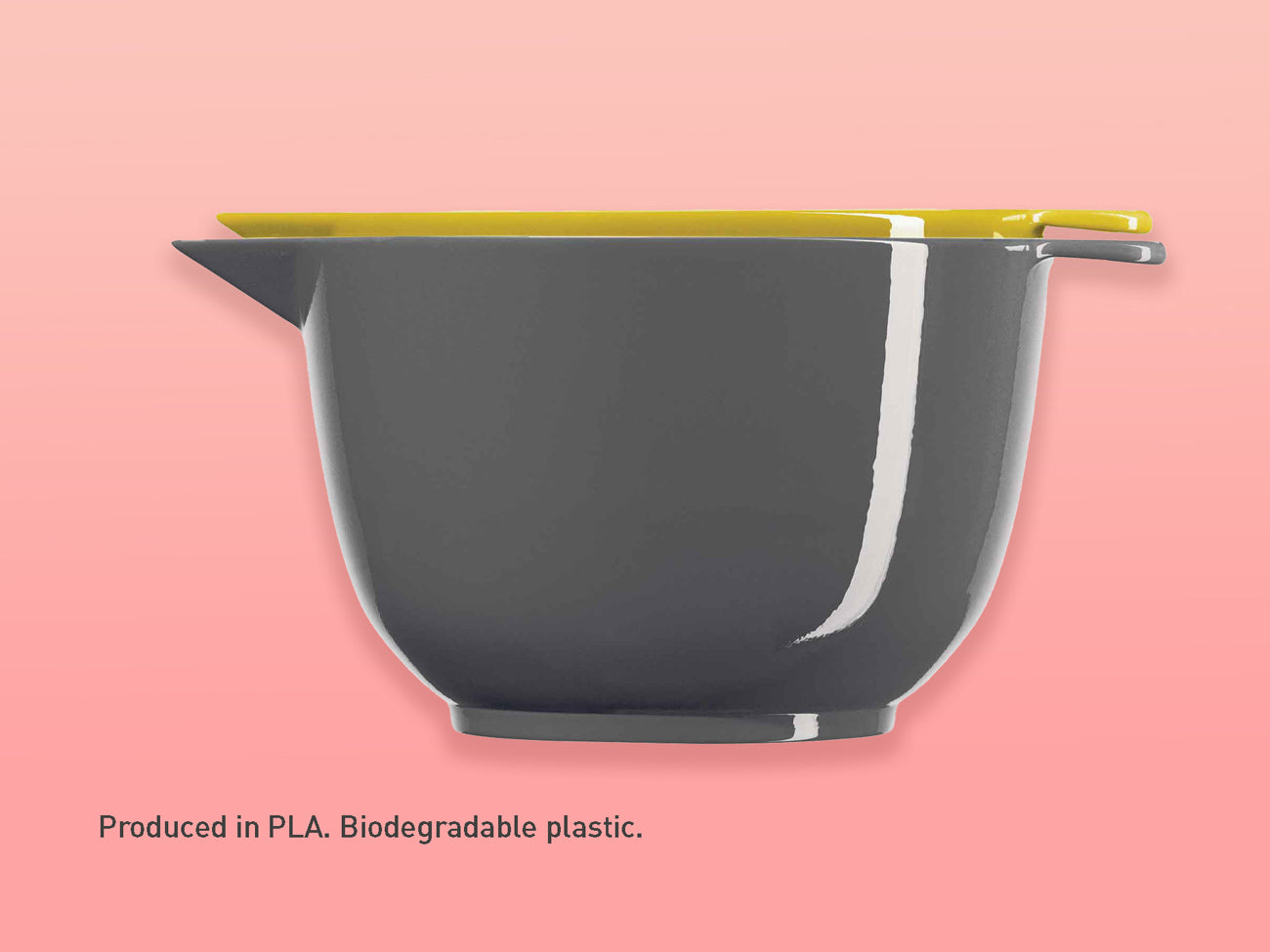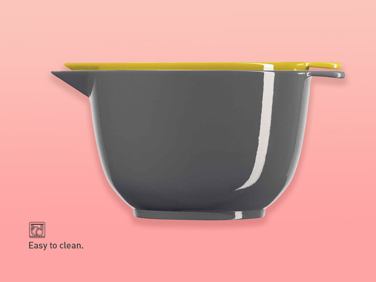 The bowls are equipped with a practical handle that provides a secure grip when stirring or whisking. They are available in Cool Gray and Lemon Yellow. The large yellow bowl has a capacity of 3 liters, while the slightly smaller and practical gray bowl holds 2.5 liters. The design combines style with functionality.
