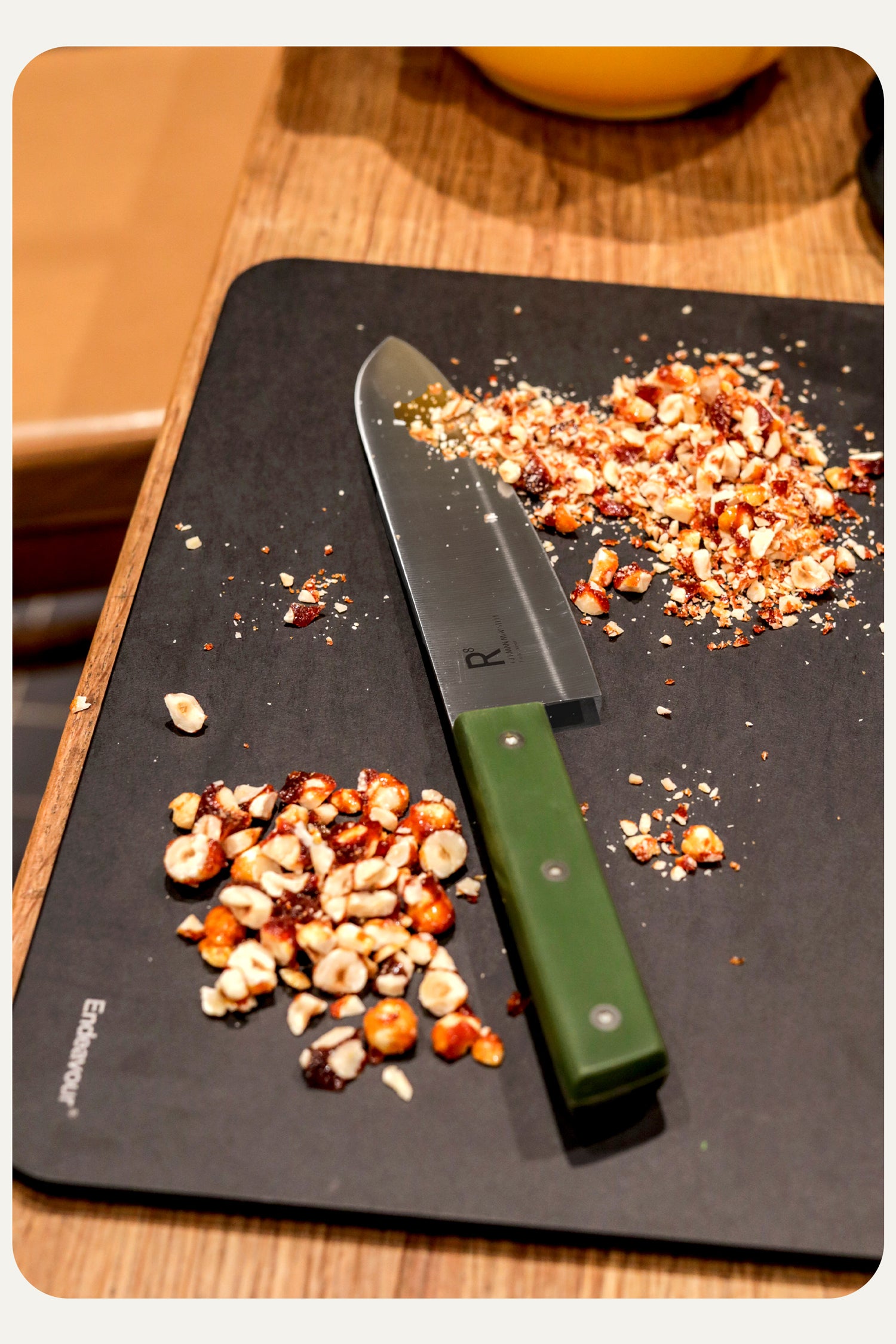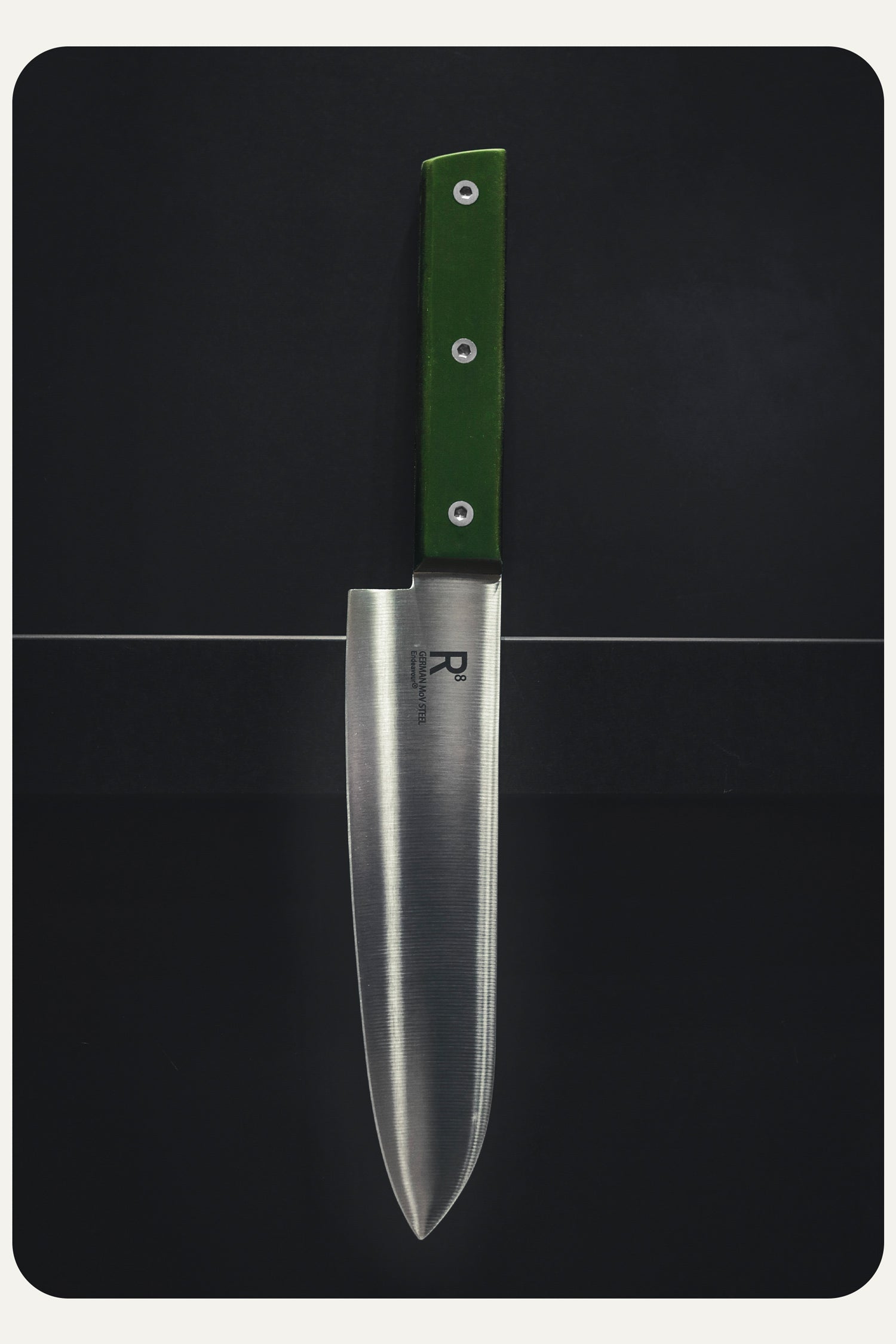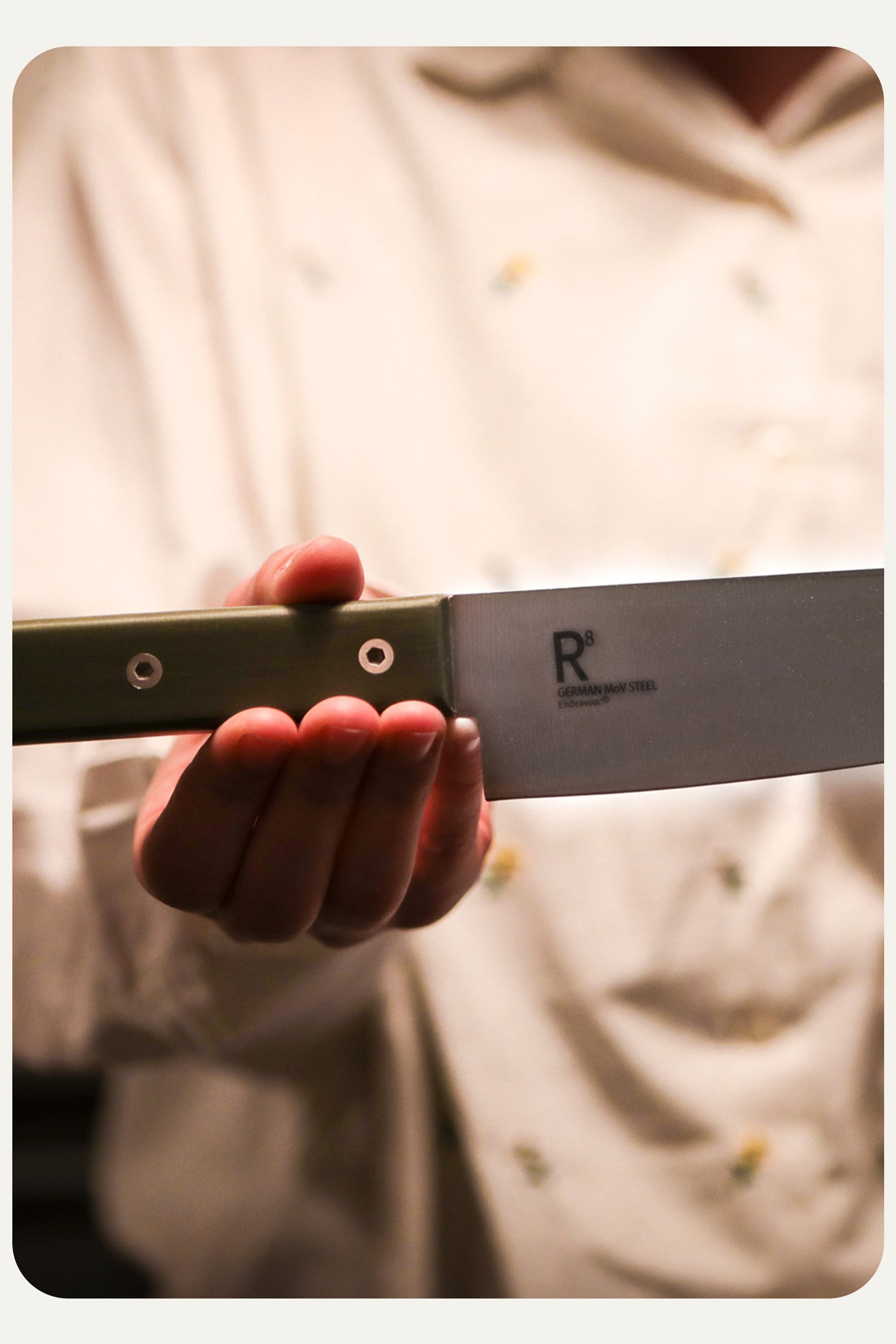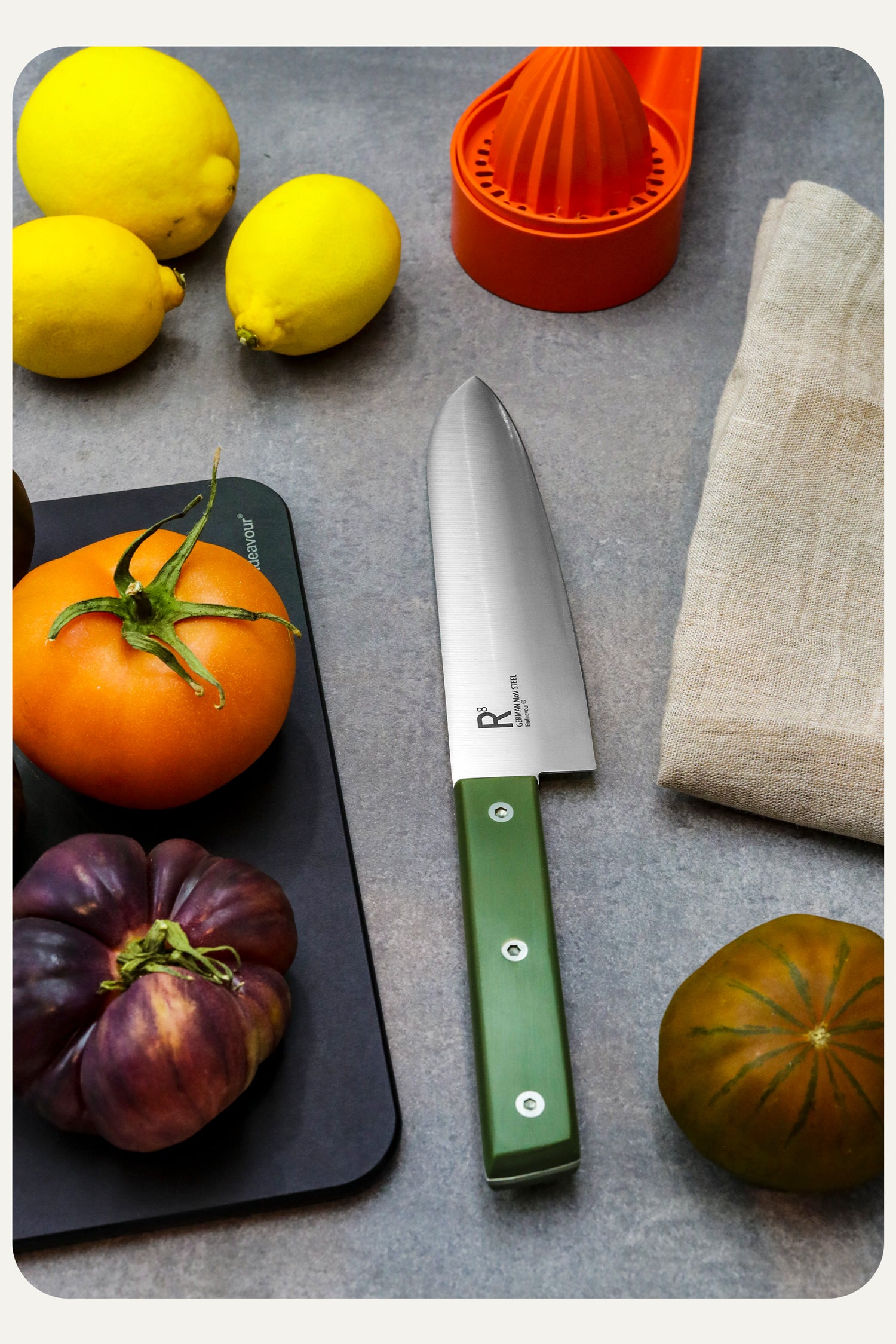 Resolution R8 is made from German Mov stainless steel. It has a hardness of HRC 55-57 and is both highly durable and supremely functional. The knife’s design is taken from the classic Santoku knife which is made for cutting and slicing into ribbons. The Santoku’s sharp and balanced design makes it simple and effortless to slice fish, meat and vegetables to just the right thickness.