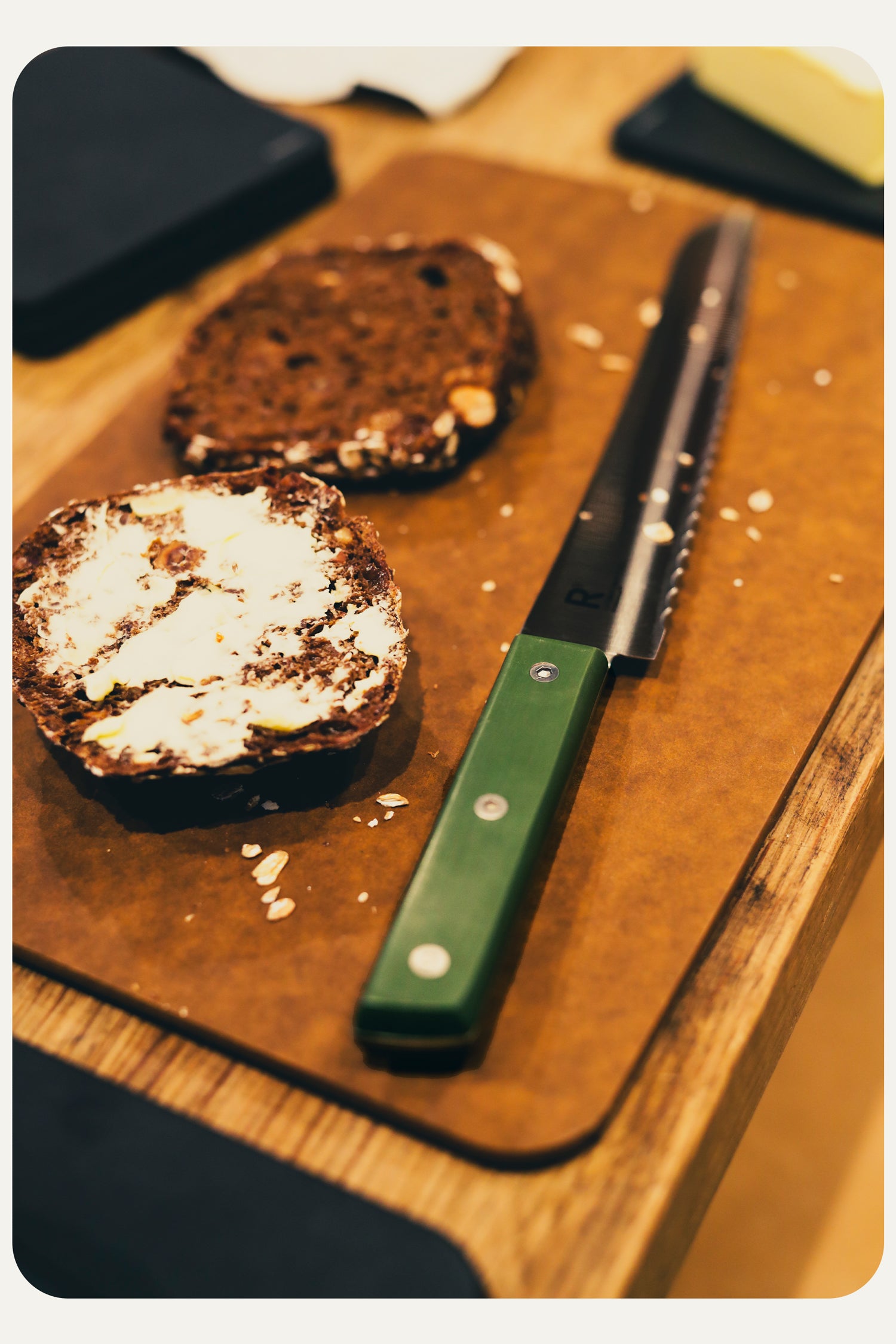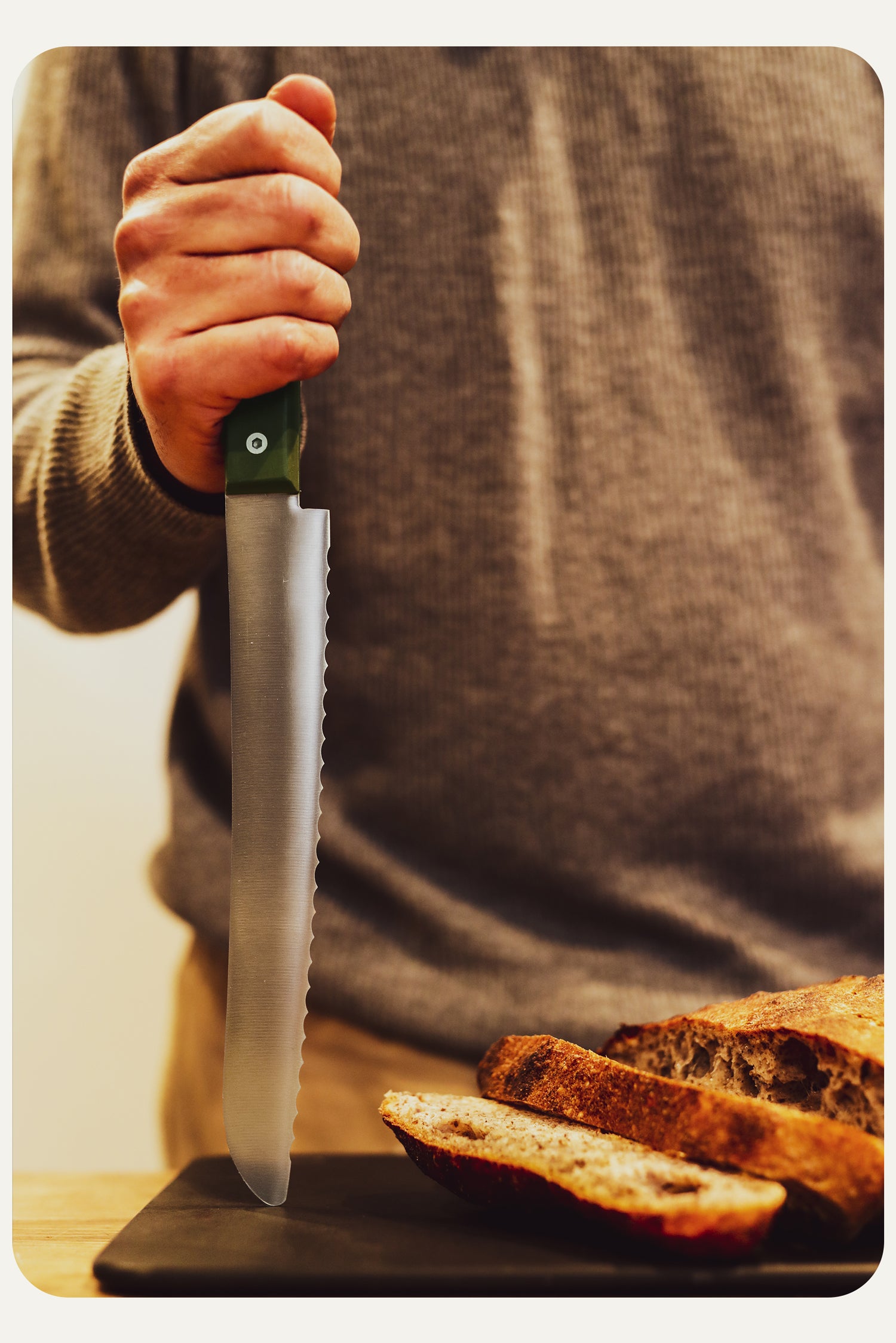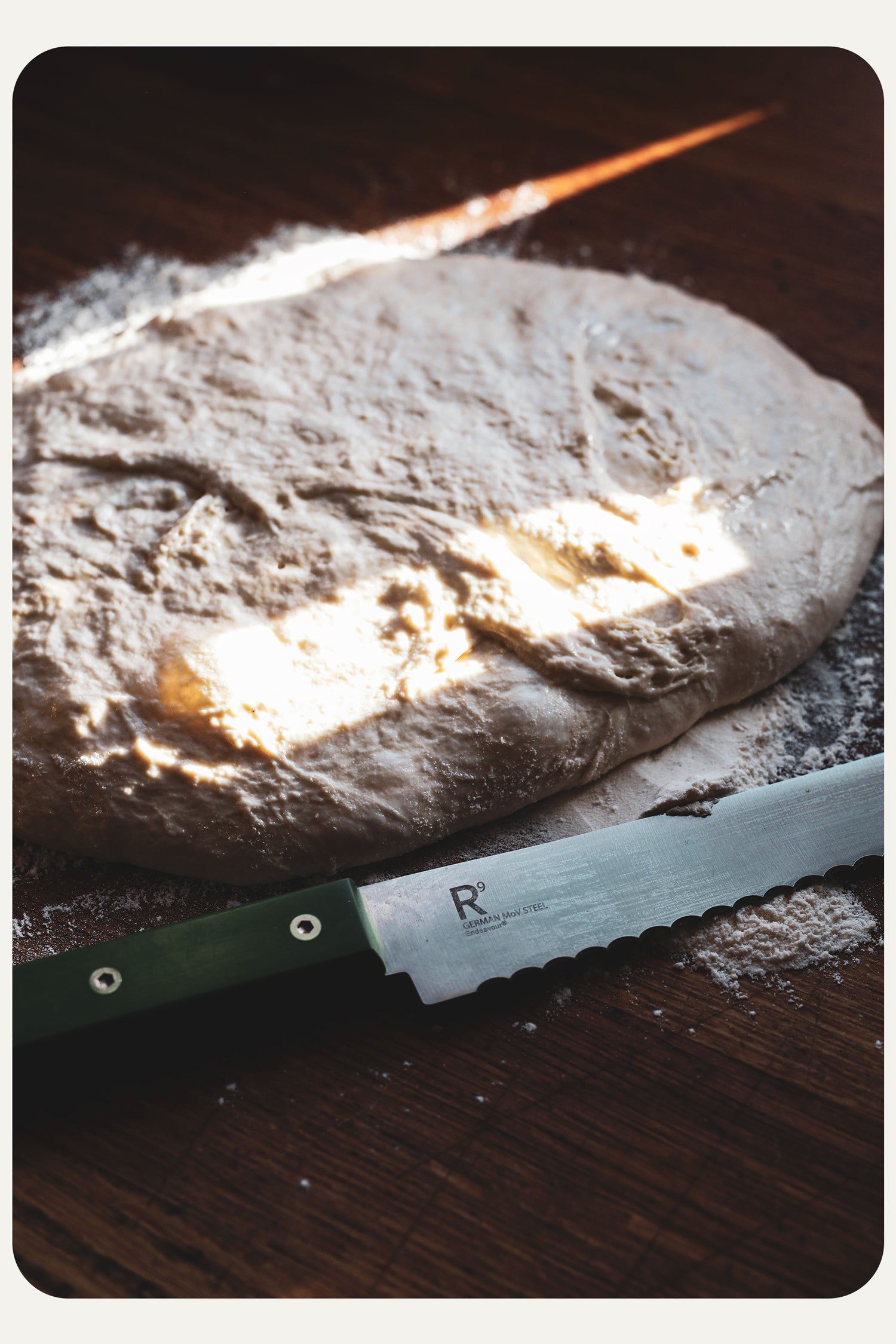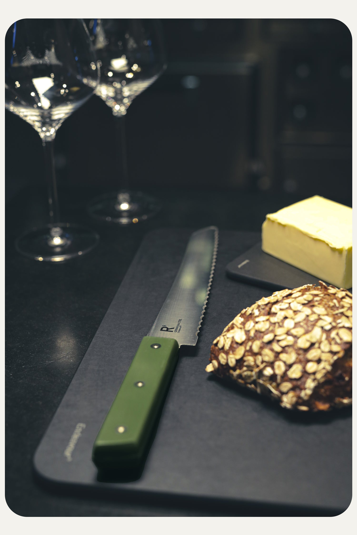 Resolution R9 is made from German Mov stainless steel. It has a hardness of HRC 55-57 and is both highly durable and supremely functional. This bread knife has a sharp, serrated blade which can easily and elegantly work its way through bread and other baked goods. The long blade makes it great even for larger loaves.