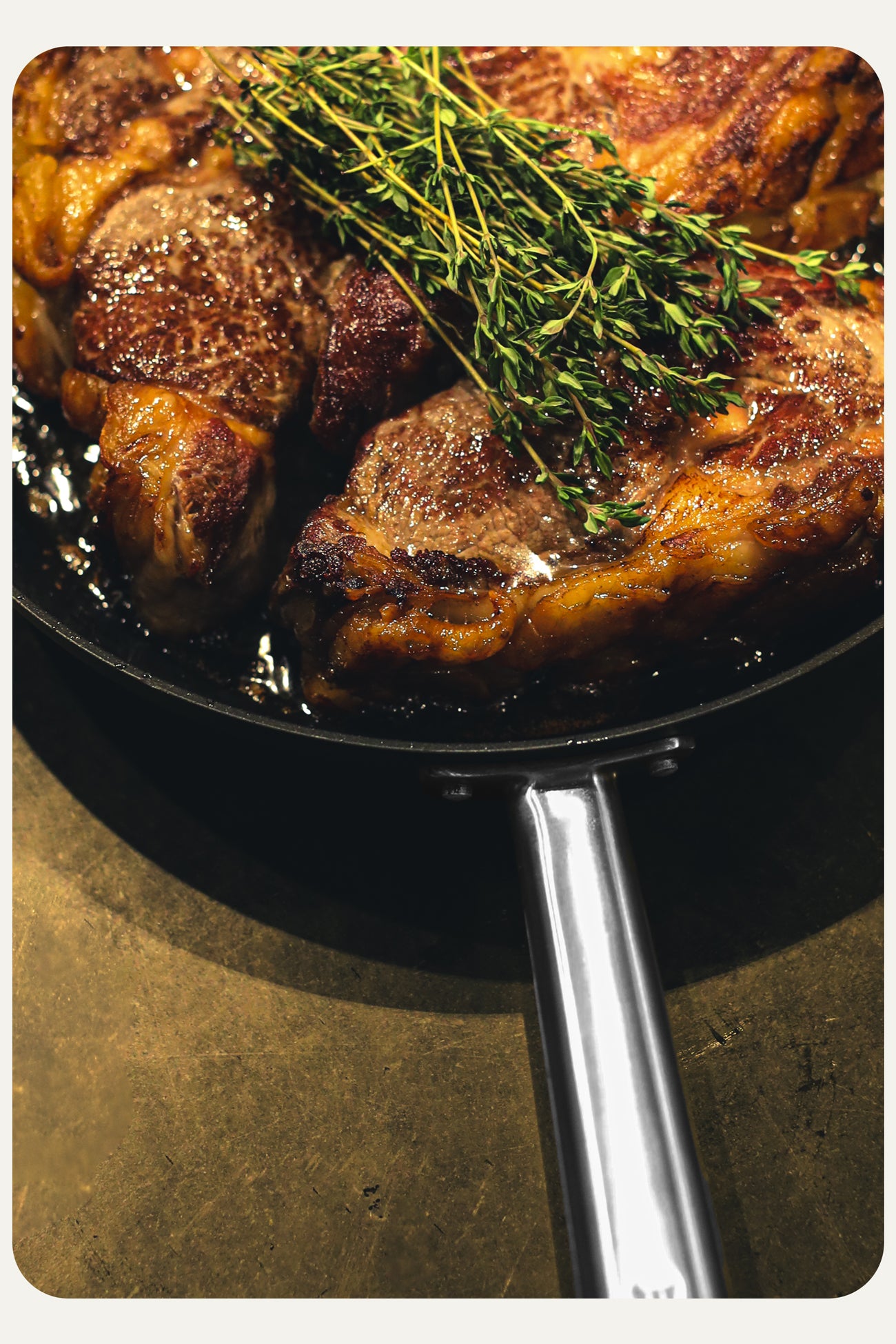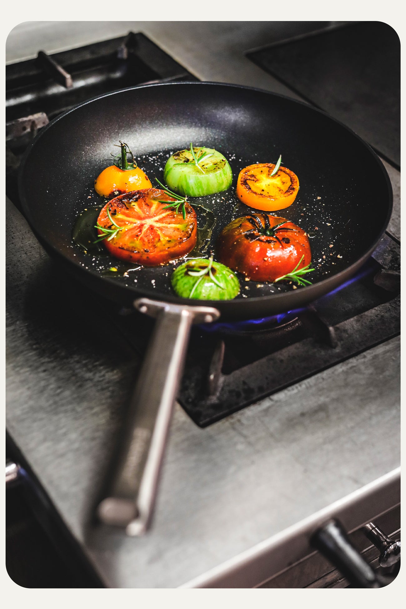 This 28 cm pan is perfect for larger tasks in the kitchen. Ideal for frying big steaks seasoned with black pepper, a whole fish, or simply for sautéing some juicy beefsteak tomatoes.