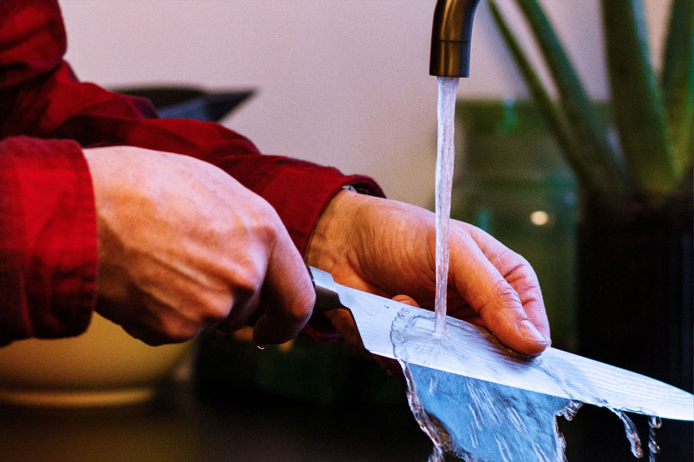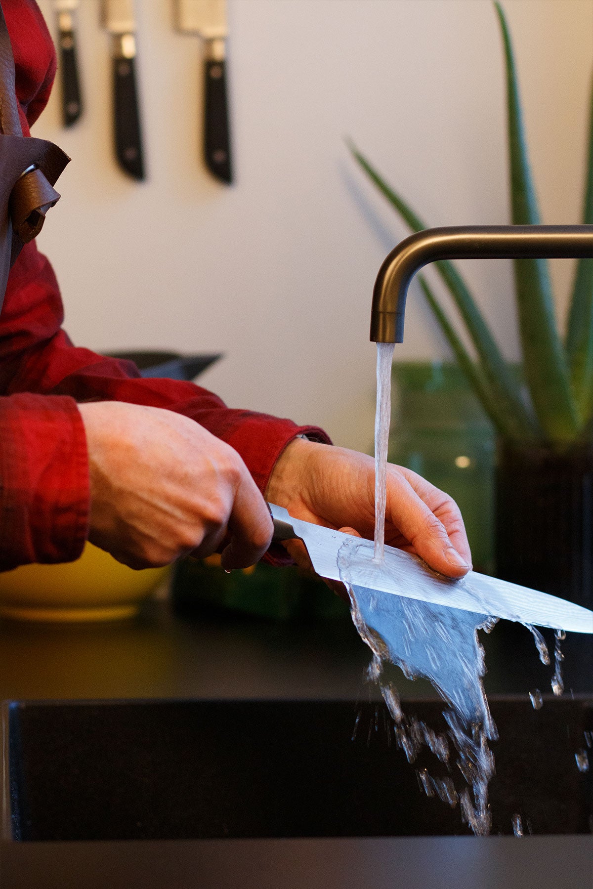 We recommend: Hand washing this knife since it's crafted from the finest VG10 Japanese steel. Use a ceramic honing rod frequently to maintain sharpness. Proper storage and occasional oiling of the handle are advisable.