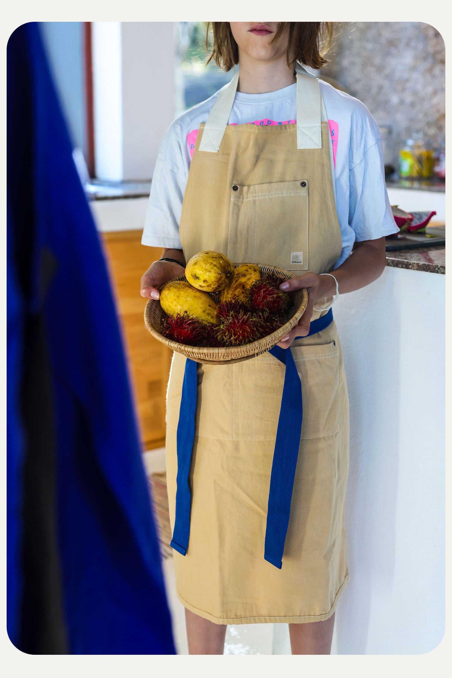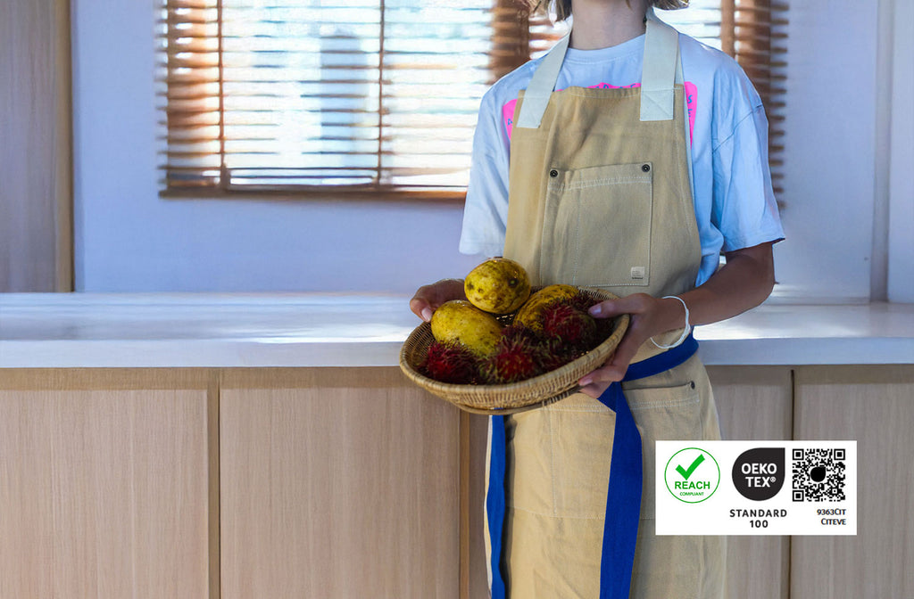 The apron is locally produced near Porto at a family-owned textile manufacturing company with over 30 years of experience. It is spun, plant-dyed, and sewn in Portugal and features soft, adjustable straps for optimal comfort.