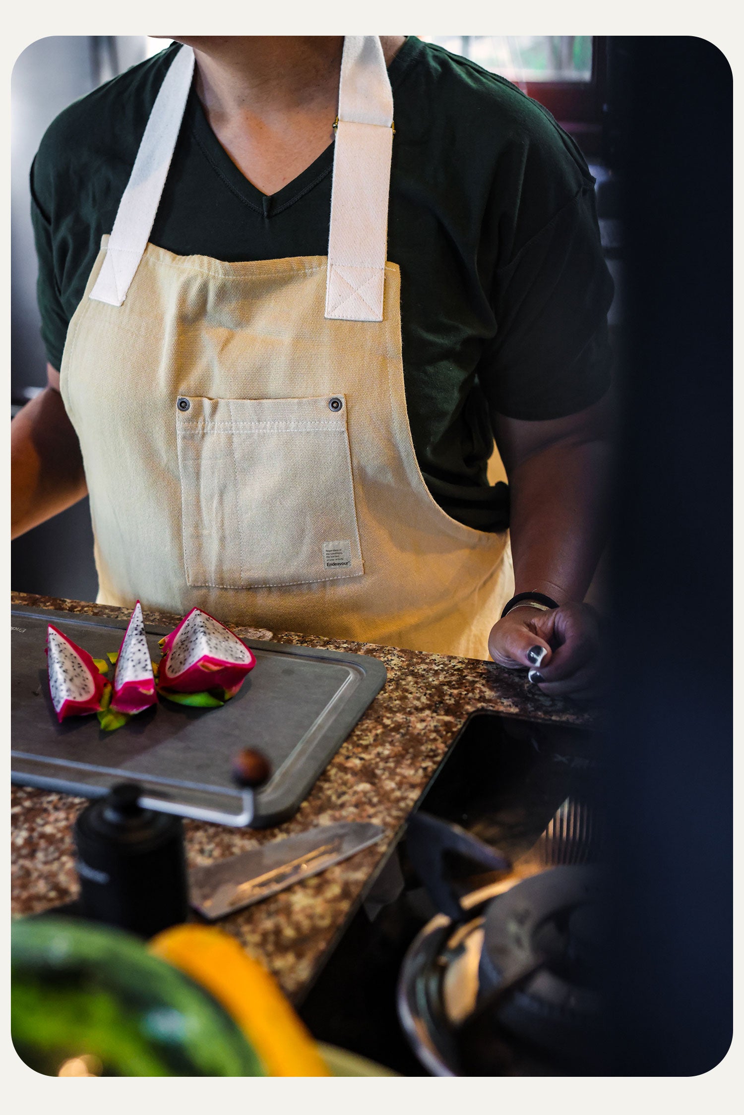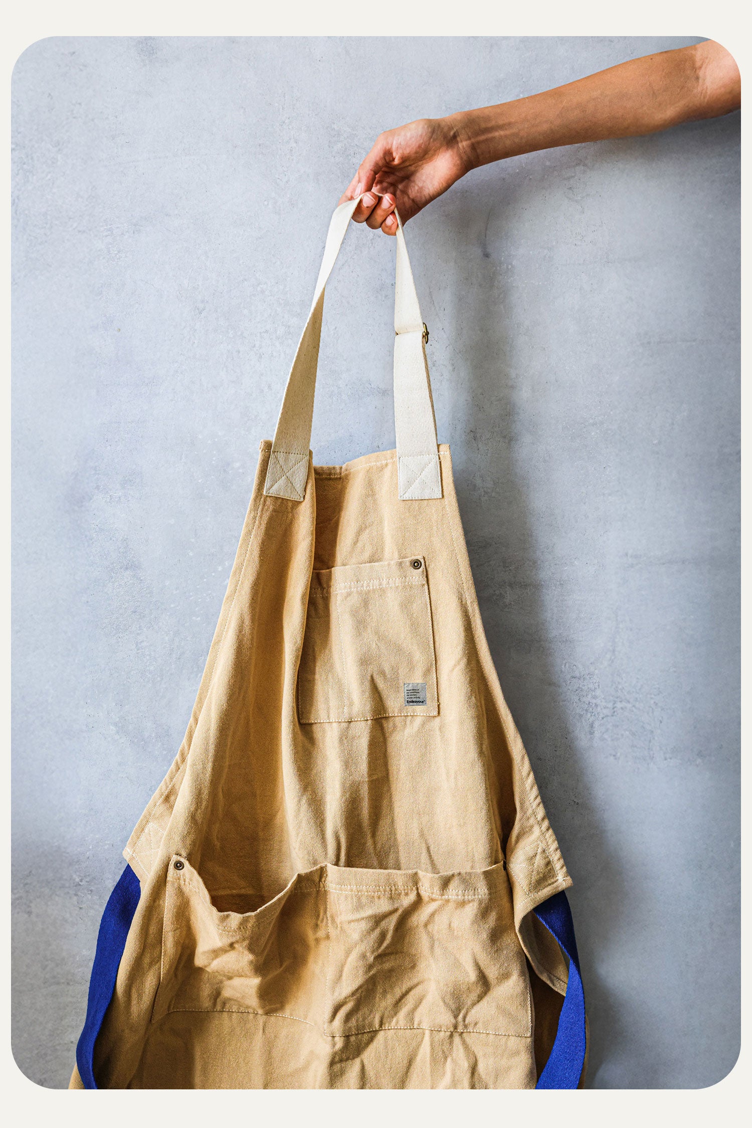 This apron is the result of an exclusive design partnership between Endeavour and a specialised, family-owned sewing atelier in Portugal with over 30 years of experience in workwear and technical textile production.