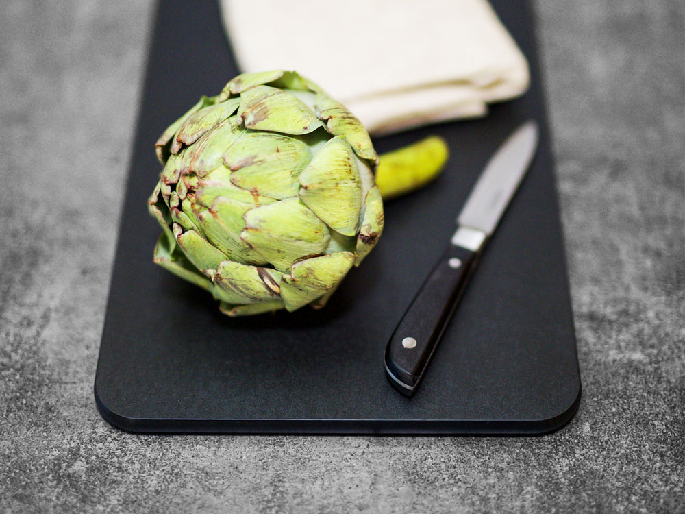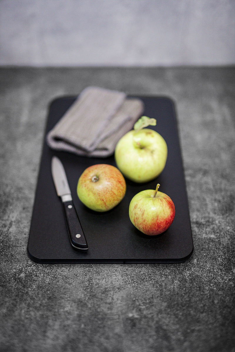 The cutting board is made from FSC®-certified organic fibers sourced from sustainable forestry. A durable and heat-resistant material that protects the knife edge and withstands temperatures up to 170°C, making it ideal as a base for hot pots. It is through-colored in Night Black. Organic fiber also resists discoloration from food – offering both hygienic and aesthetic benefits.