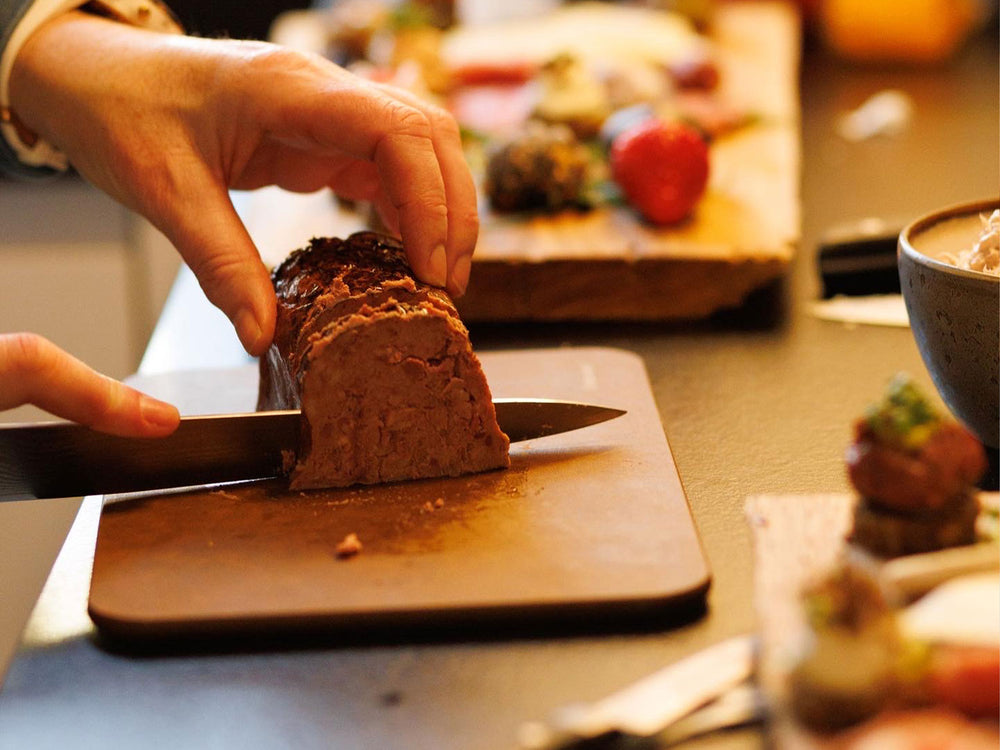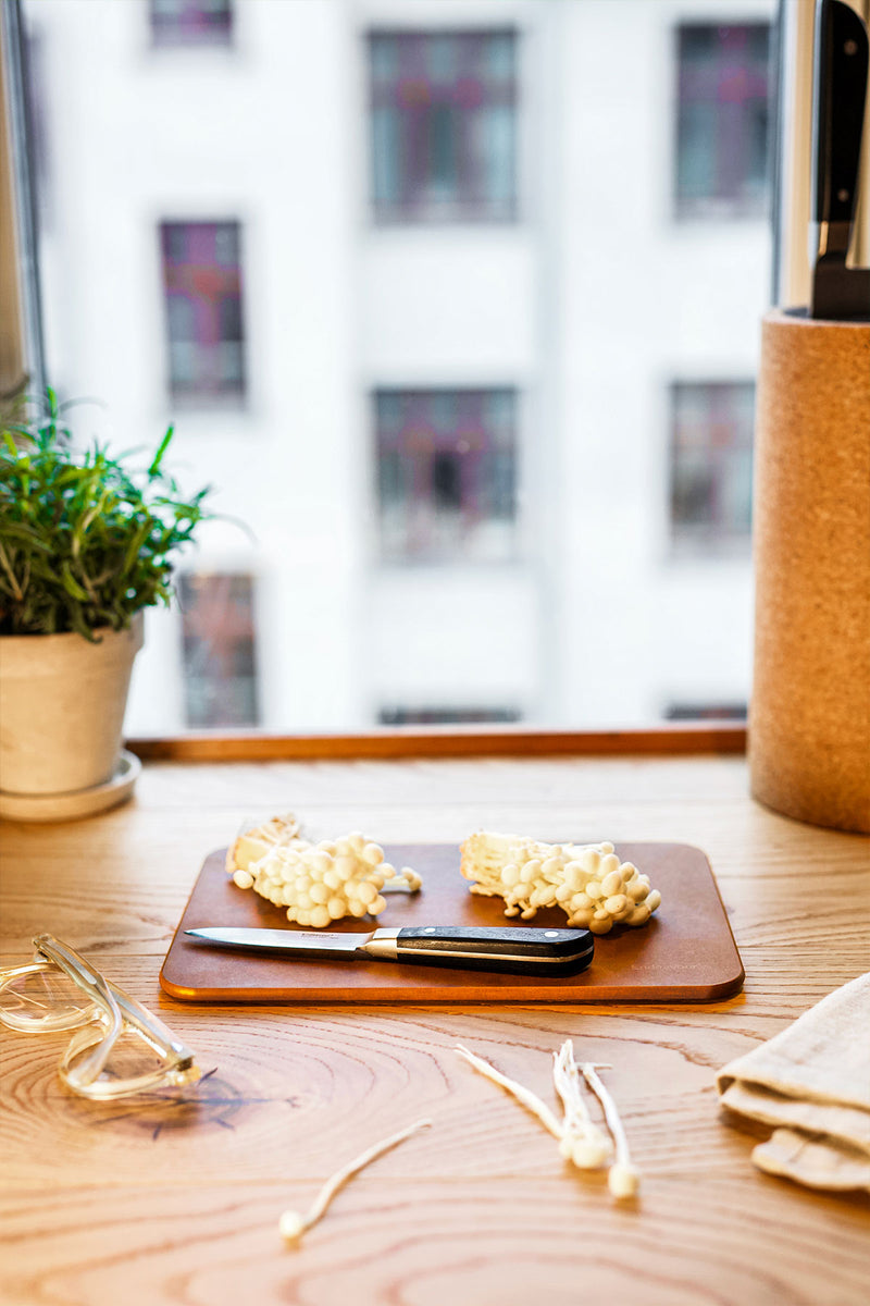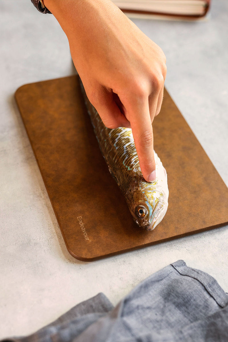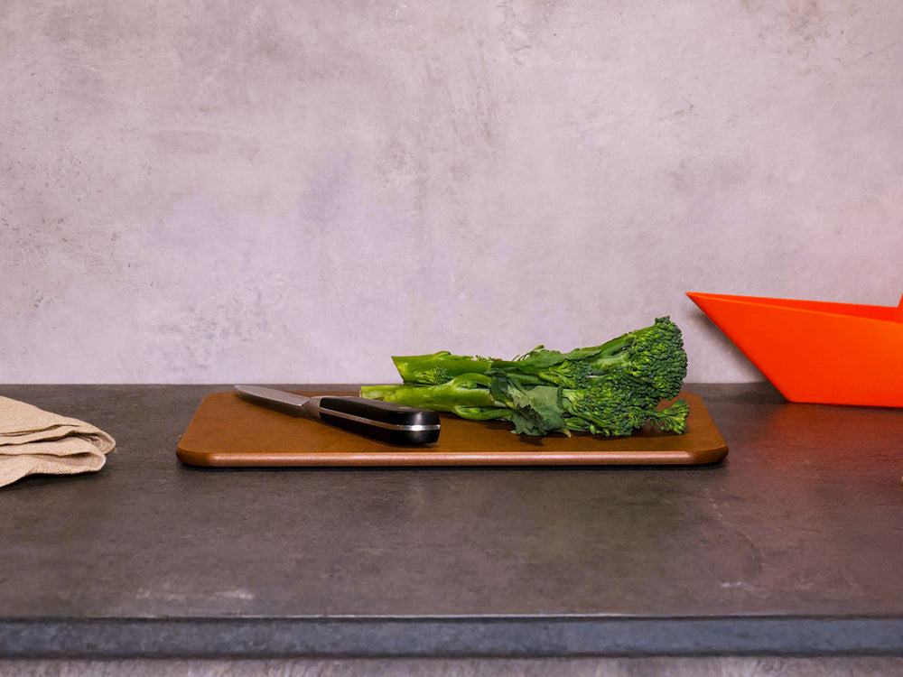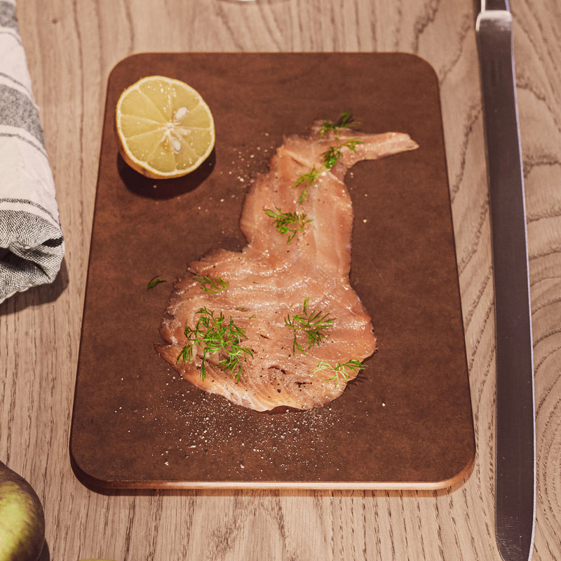 The cutting board is made from FSC®-certified organic fibers sourced from sustainable forestry. A durable and heat-resistant material that protects the knife edge and withstands temperatures up to 170°C, making it ideal as a base for hot pots. It is through-colored in Forest Brown. Organic fiber also resists discoloration from food – offering both hygienic and aesthetic benefits.