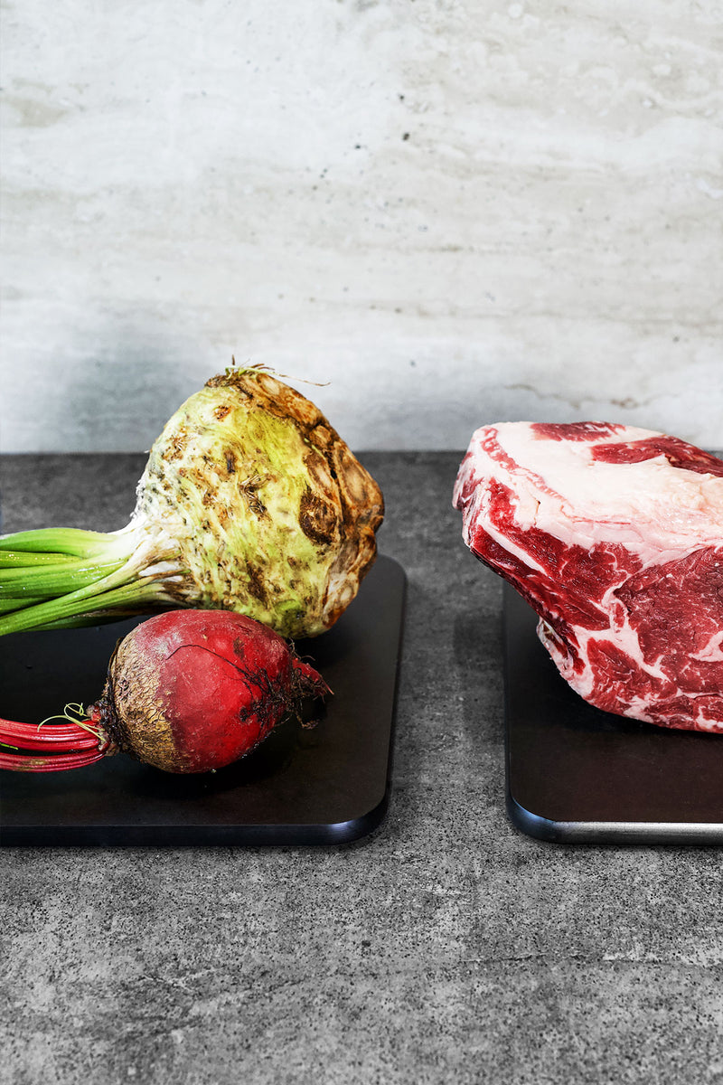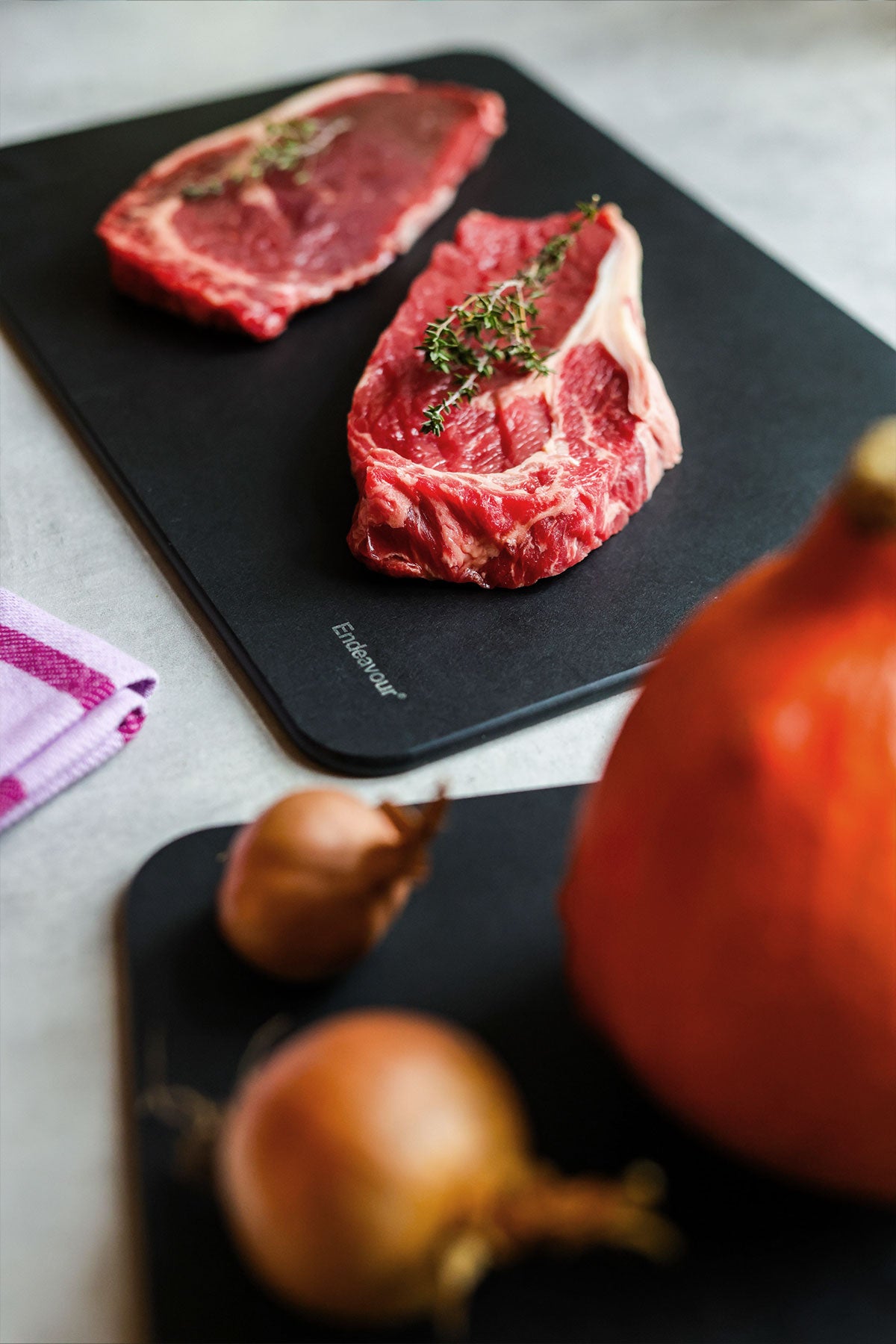 The cutting board is made from FSC®-certified organic fibers sourced from sustainable forestry. A durable and heat-resistant material that protects the knife edge and withstands temperatures up to 170°C, making it ideal as a base for hot pots. It is through-colored in Night Black. Organic fiber also resists discoloration from food – offering both hygienic and aesthetic benefits.
