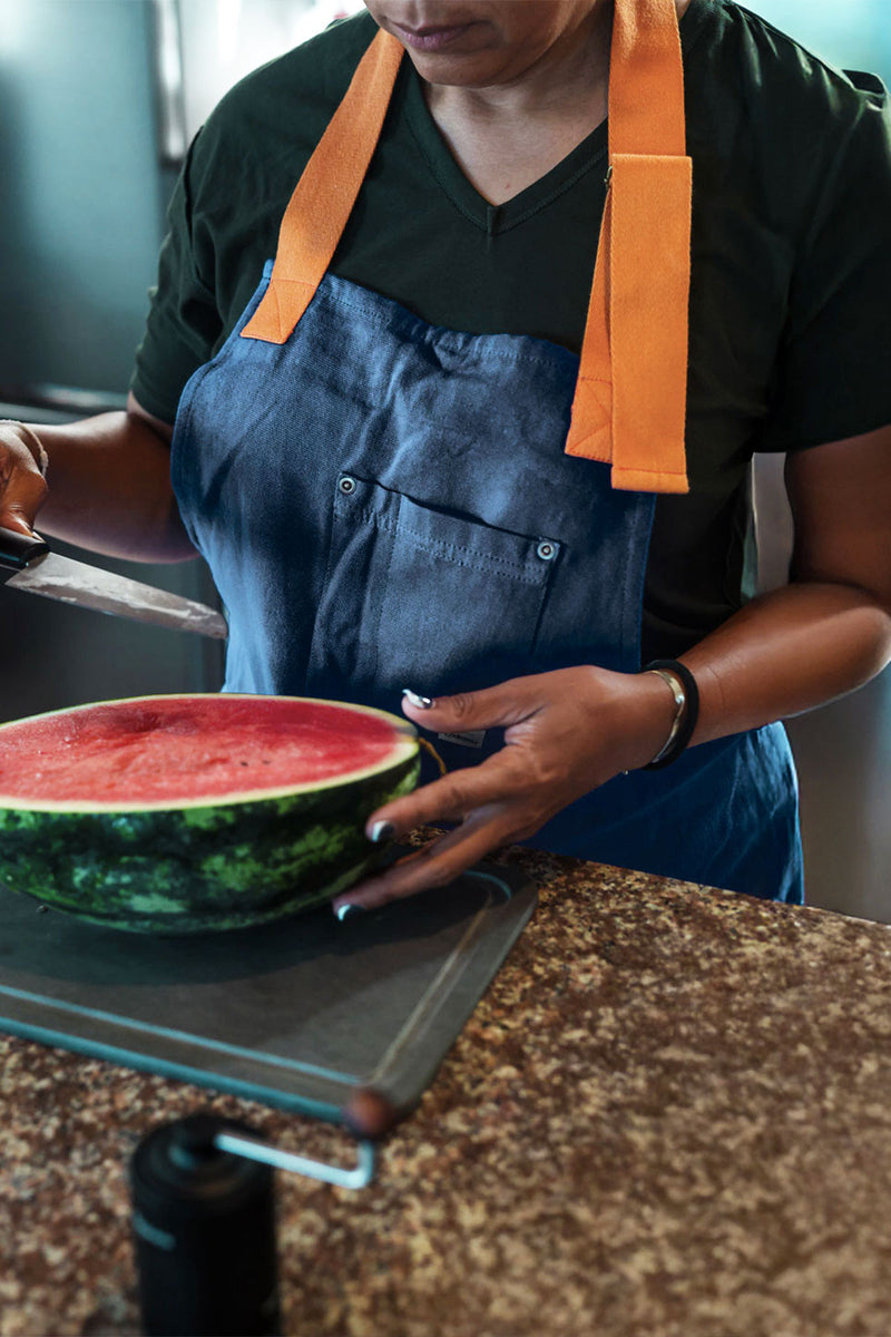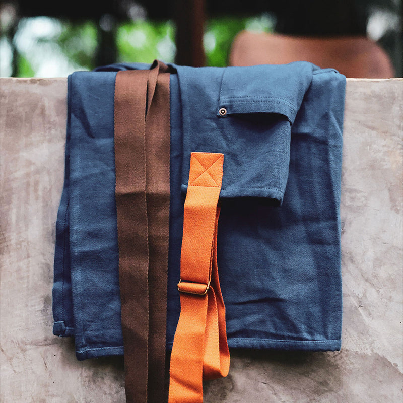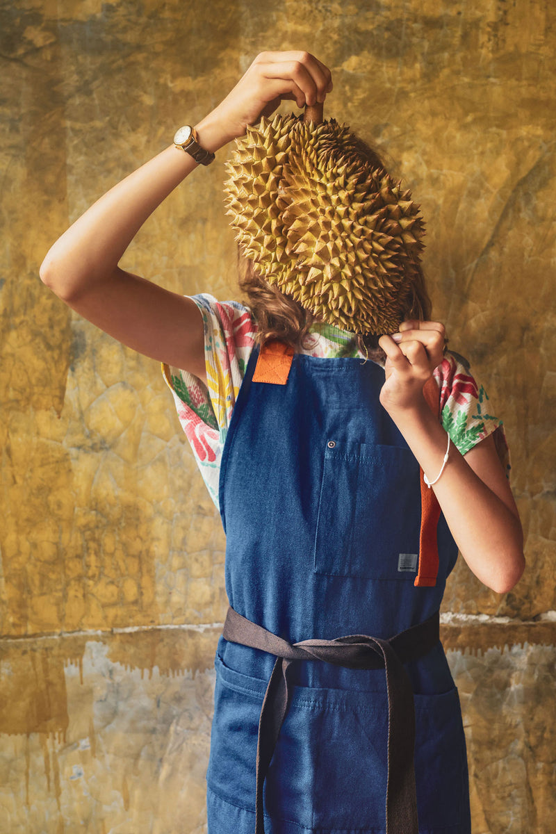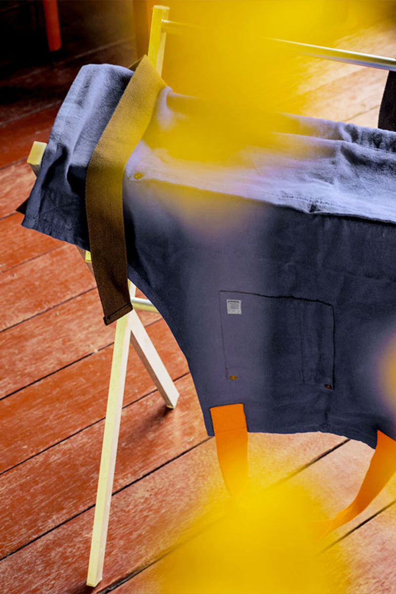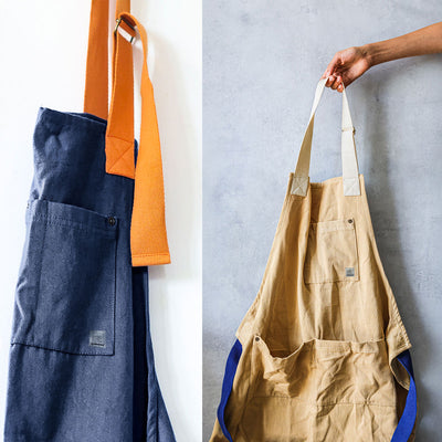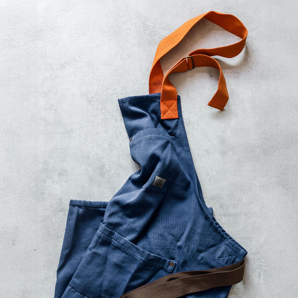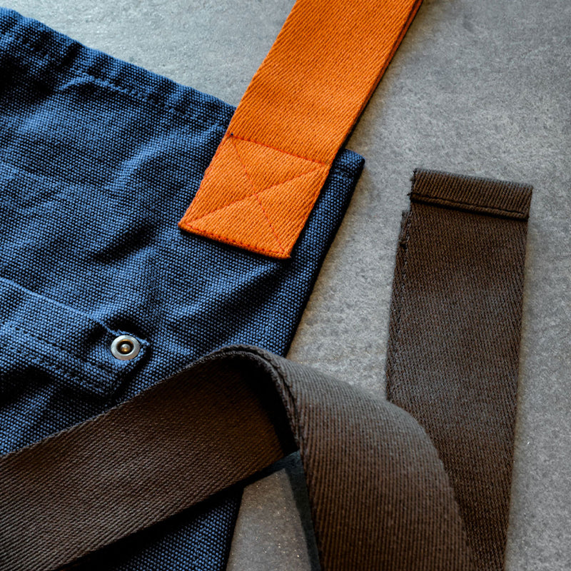 Forklædet er fremstillet i kraftig canvas af 100 % bomuld, spundet og plantefarvet lokalt i det nordlige Portugal, og præcisionssyet nær Porto.