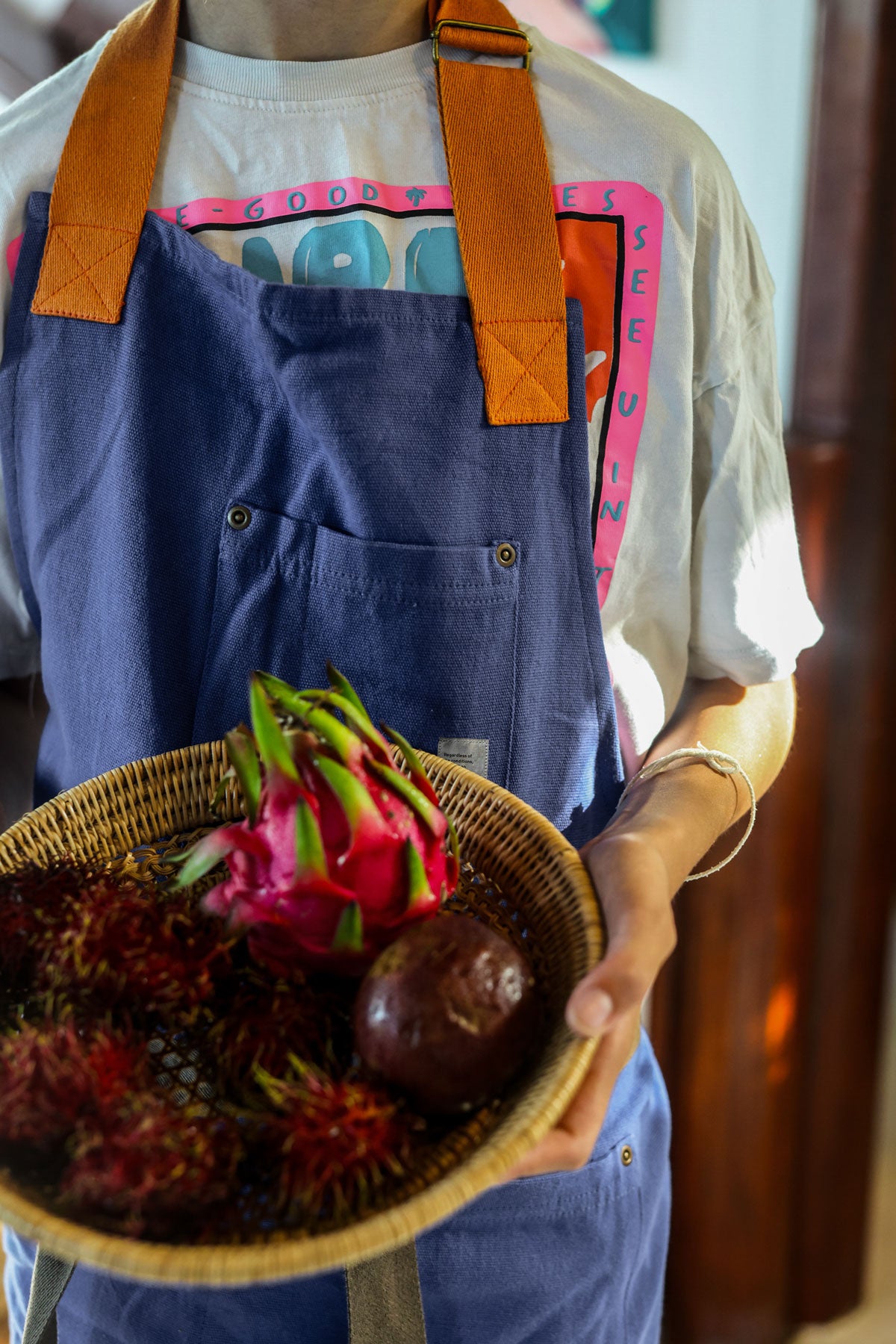 Designet tager udgangspunkt i det klassiske kokkeforklæde, men er nyfortolket i en moderne kontekst med fokus på form, funktion og materialitet.