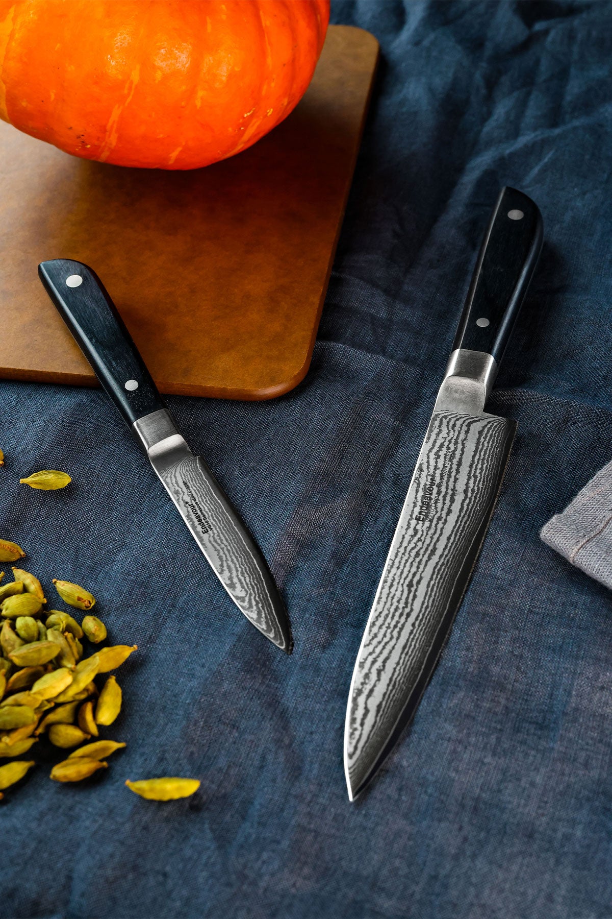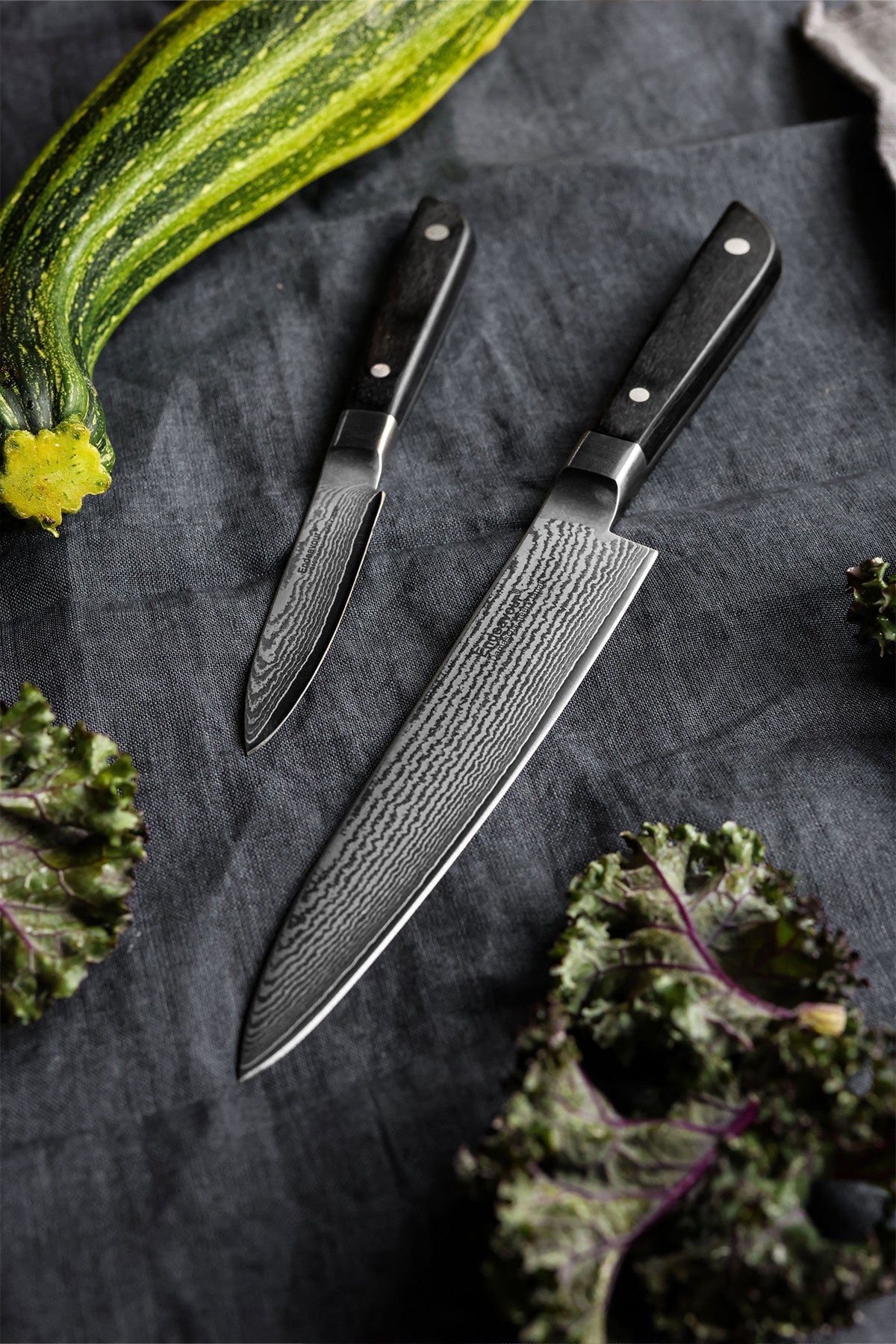 Discovery Pro Green Edition. Det perfekte startkit til madlavning i hverdagen. Sættet indeholder Herb og Fruit knivene, som er ideelle til præcisionsarbejde og alsidige opgaver såsom at skære frugt og grøntsager. Smedet af japansk VG10 guldstål med et 67-lags Damaskus-design og ergonomiske håndtag i pakkatræ, hvilket sikrer både komfort og præcision. Et pålideligt valg til at opbygge en holdbar knivsamling.