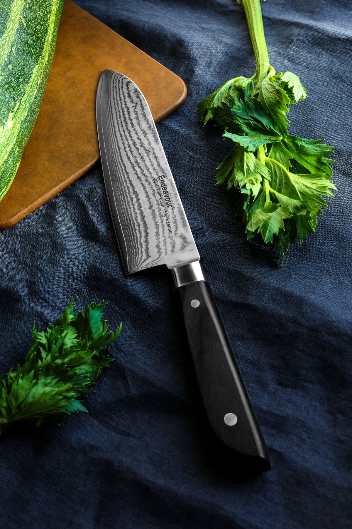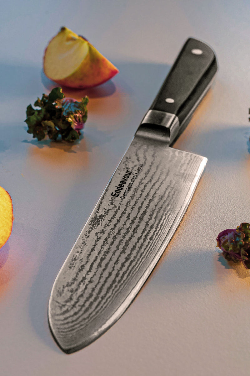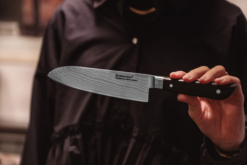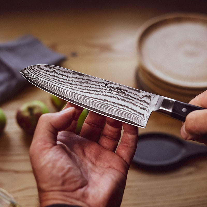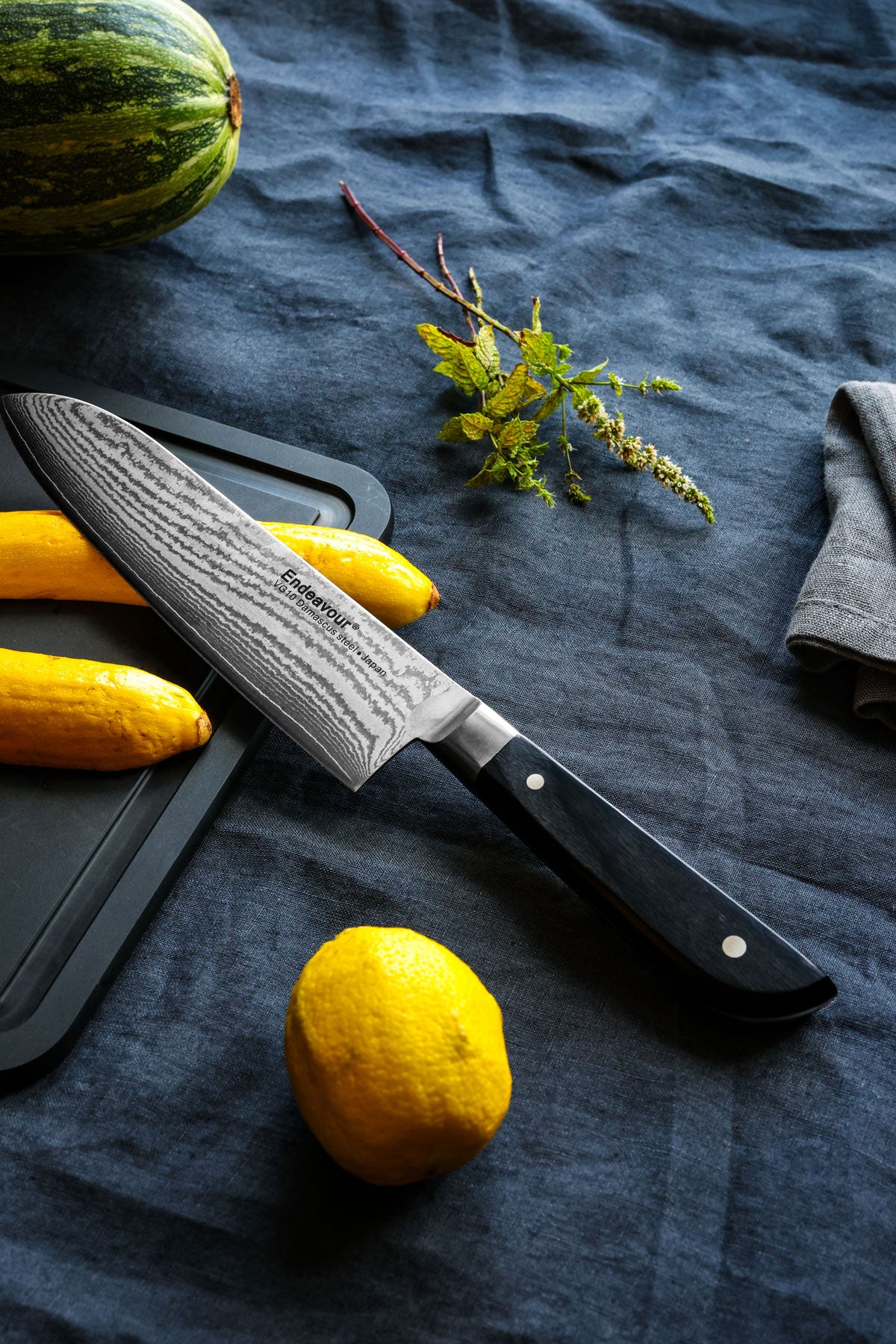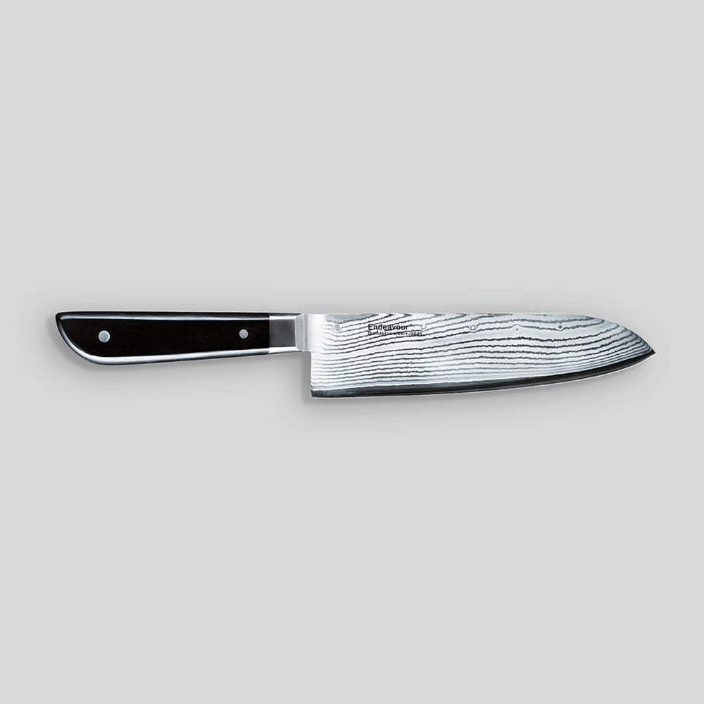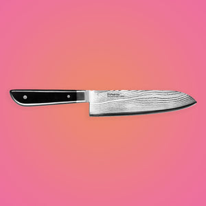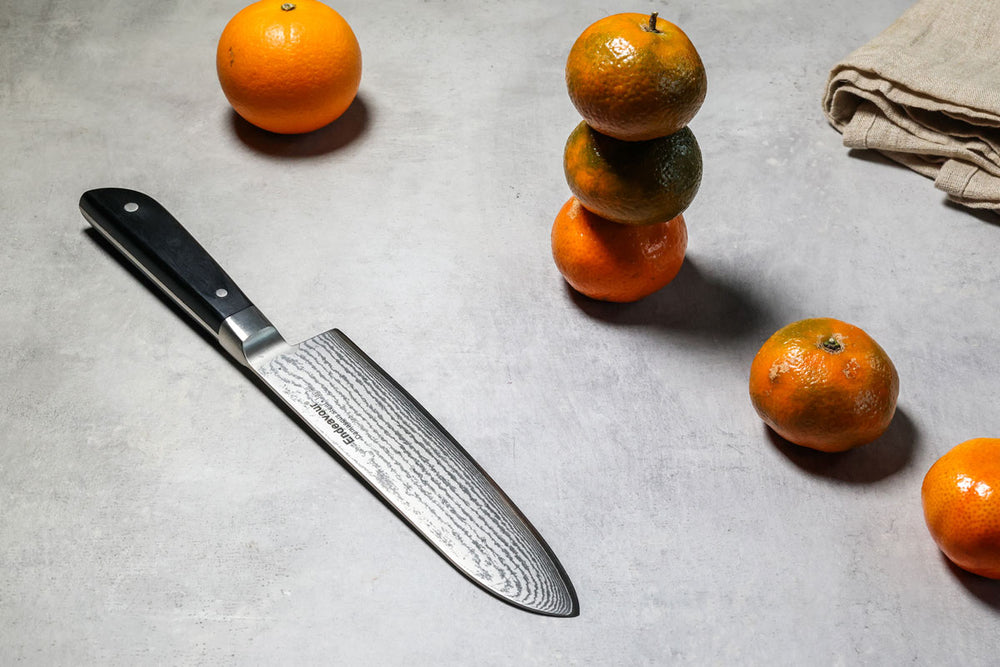Mød Santoku, den mest anvendte universal-kniv i det japanske køkken. Med et overlegent og stabilt blad samt et ergonomisk, vandafvisende håndtag er denne kniv ideel til både rutinearbejde og præcisionsopgaver med grøntsager og frugt.