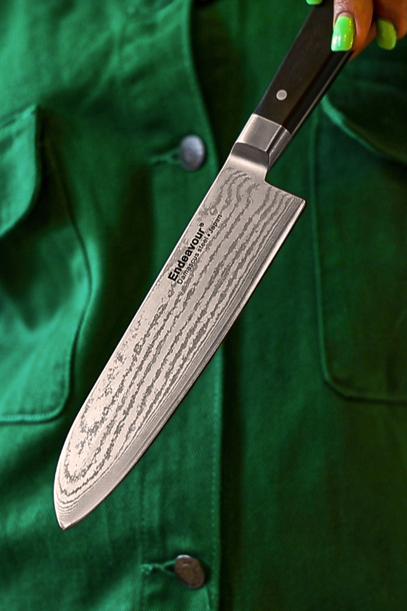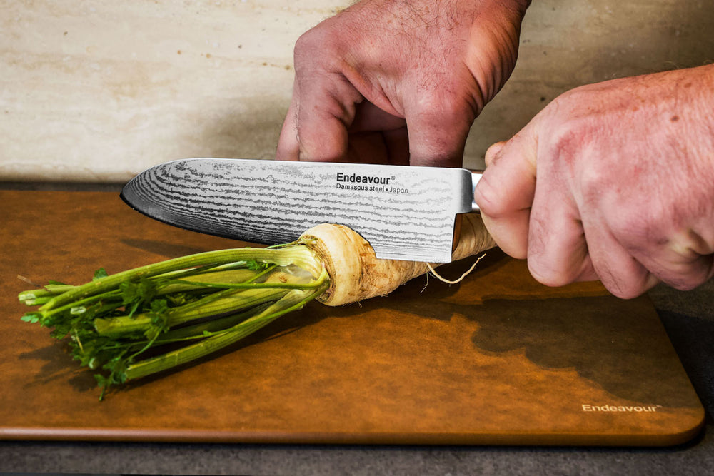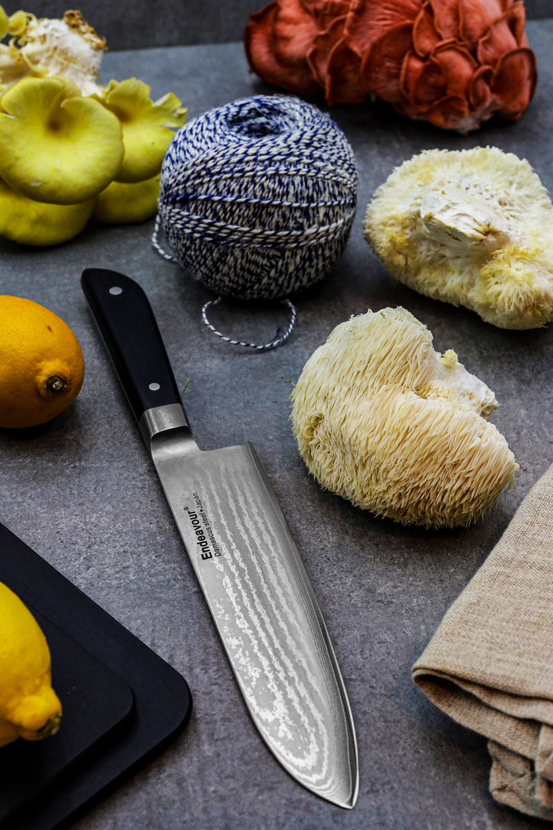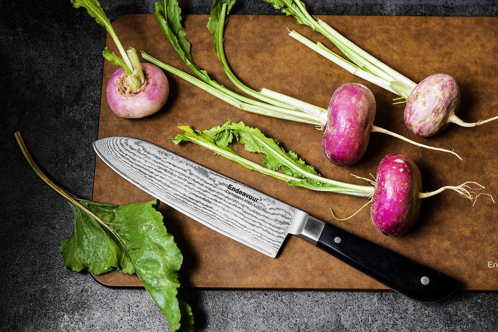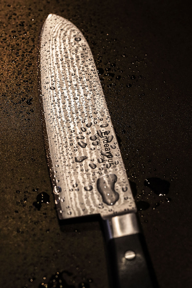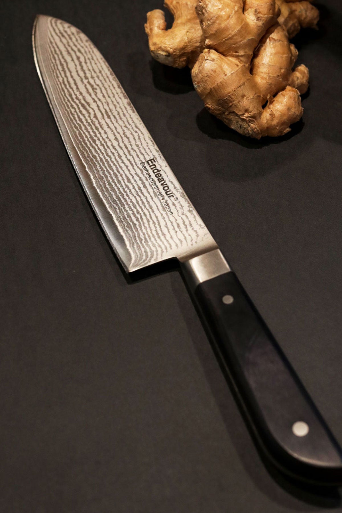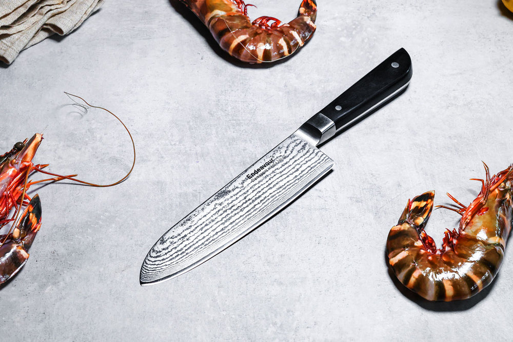 Mød Santoku, den mest anvendte universal-kniv i det japanske køkken. Med et overlegent og stabilt blad samt et ergonomisk, vandafvisende håndtag er denne kniv ideel til både rutinearbejde og præcisionsopgaver med grøntsager og frugt.